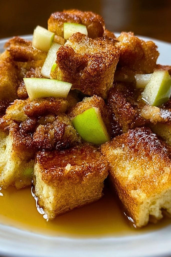 Grease a 9×13-inch baking dish with butter. Add half of the bread cubes, then layer half the diced apples on top. Pour half of the custard mixture evenly over this first layer. Repeat with the remaining bread and apples, then pour the remaining custard mixture on top. Lightly press down with a spatula to help the bread absorb the liquid.