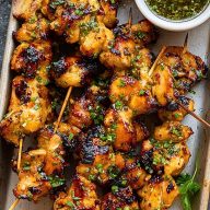 Rich and flaky salmon balances the crisp, fresh veggies in the salad—plus, it looks beautiful plated together. - Garlic Shrimp Skewers