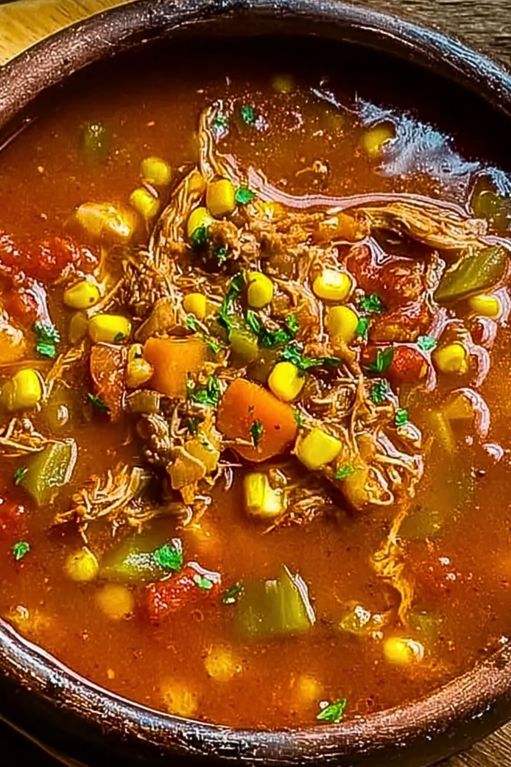 Once the vegetables are tender, add the shredded chicken, shredded pork, and corn kernels. Stir well so the meats absorb the flavorful broth. Continue simmering uncovered for another 20–30 minutes to thicken the stew and deepen the flavor.