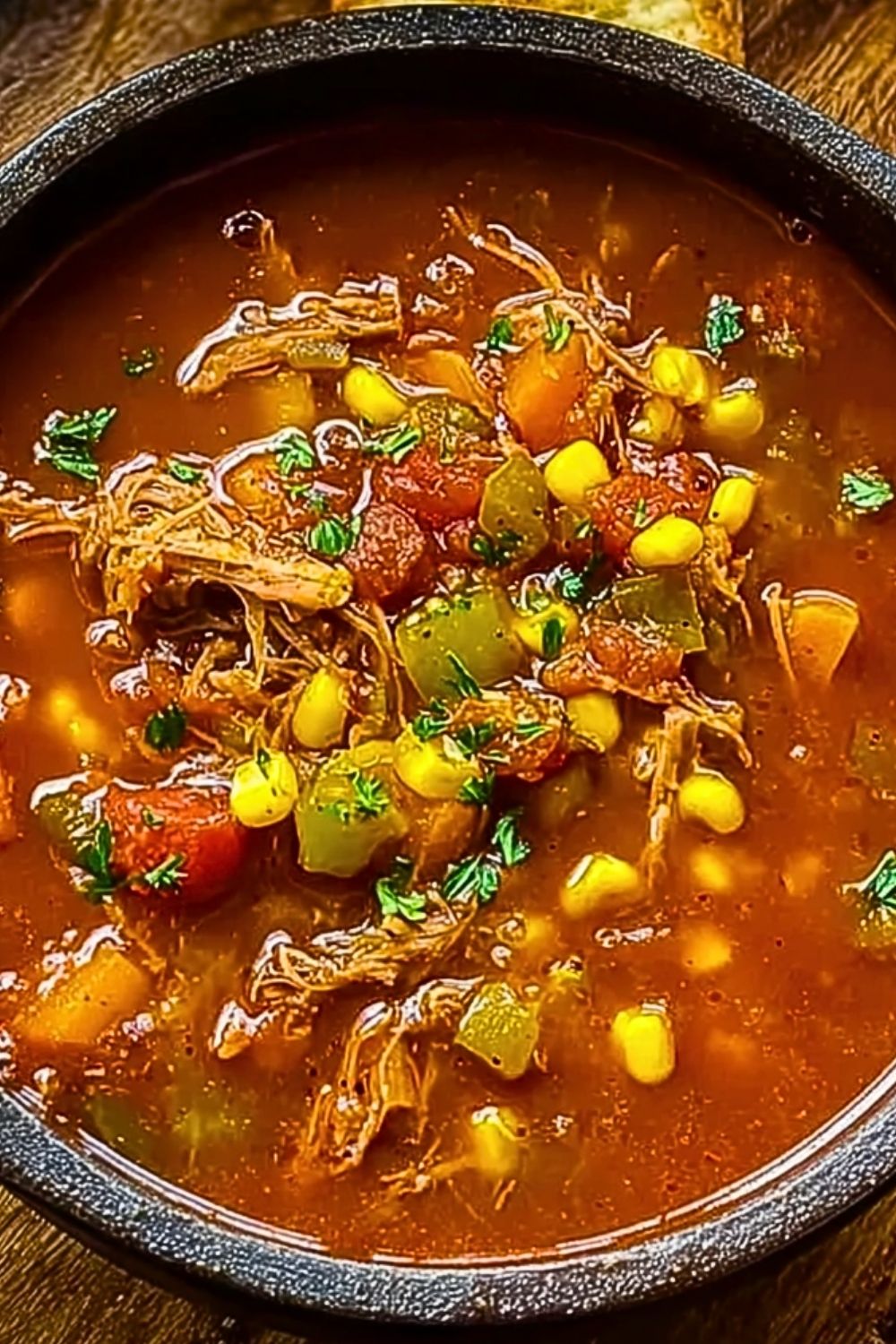 5. Stir in shredded chicken, shredded pork, and corn and cook uncovered until thick and hearty.