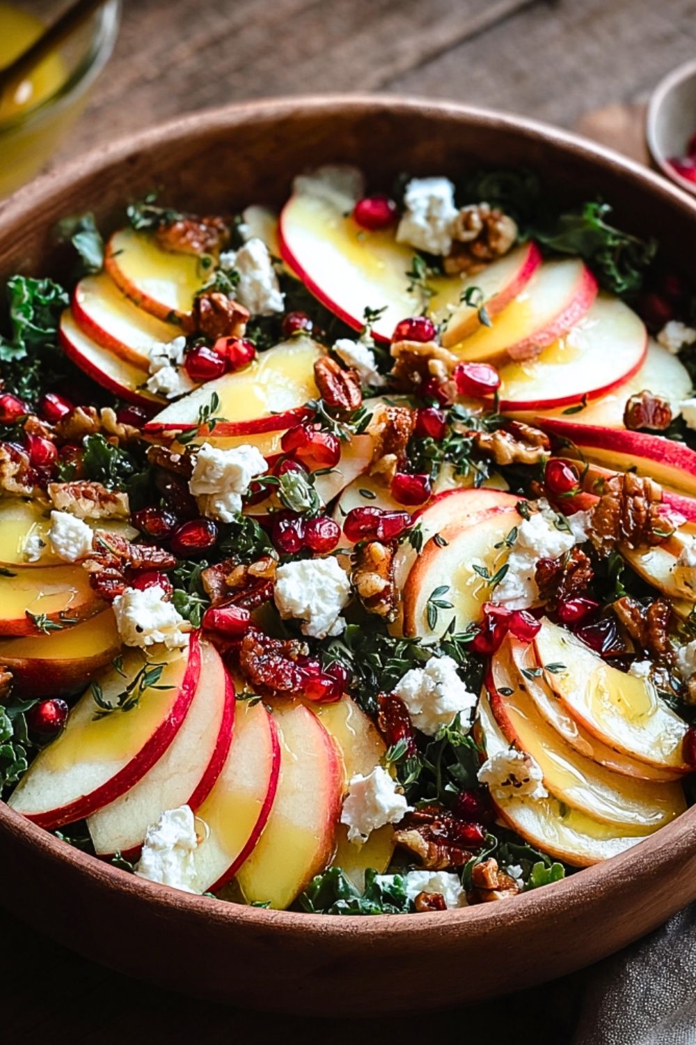 Place the massaged kale as a base on a large serving plate or bowl. Arrange the apple slices over the top in a circular pattern or mixed in naturally. Sprinkle with toasted walnuts, pomegranate seeds, and crumbled feta cheese. Drizzle the dressing evenly over the salad.