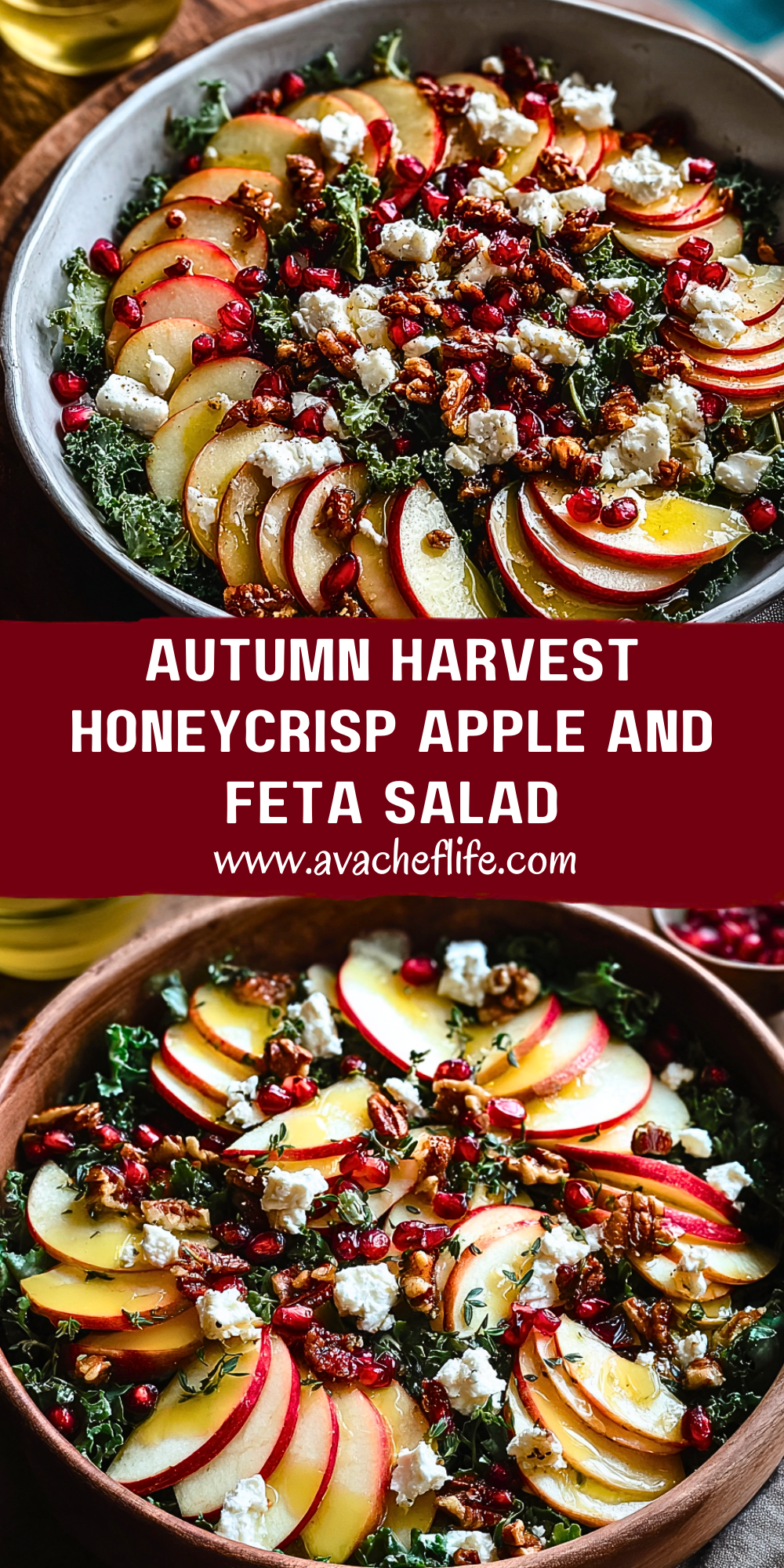 A celebration of fall on a plate, the Autumn Harvest Honeycrisp Apple and Feta Salad combines crisp textures, sweet and savory flavors, and stunning color for a dish that tastes as vibrant as it looks. Each bite offers the crunch of fresh apples, the rich tang of feta, earthy kale, toasty walnuts, and a pop of juicy pomegranate seeds—all lightly dressed in a simple vinaigrette that ties everything together beautifully.