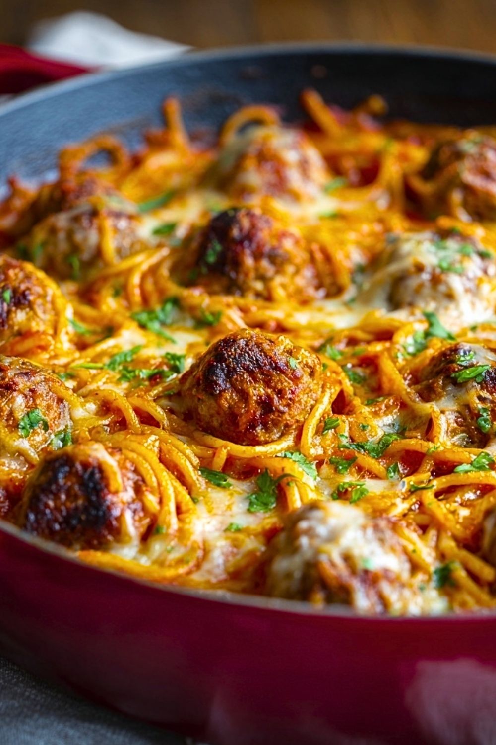 Keywords: easy recipe, quick dinner, baked spaghetti, meatballs, family dinner, comfort food, meal prep, kid-friendly, pasta bake