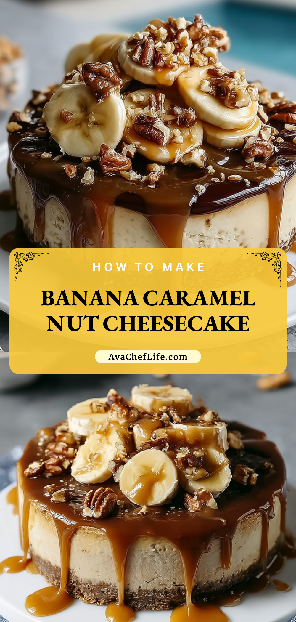 Keywords: banana cheesecake, caramel nut cheesecake, easy dessert, holiday cheesecake, creamy cheesecake, banana dessert