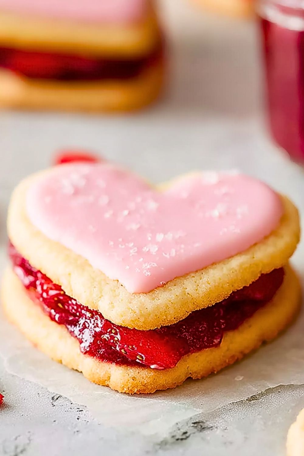 Make sure your butter is truly at room temperature before starting—this is key for a well-creamed dough that holds its shape. Chill the dough after cutting out the heart shapes to help the cookies retain their form during baking. When spreading jam, don’t overfill or it will ooze out; a thin, even layer works best. Let cookies cool completely before icing or assembling to avoid melting. For a glossy, smooth icing finish, allow the glaze to set undisturbed at room temperature.