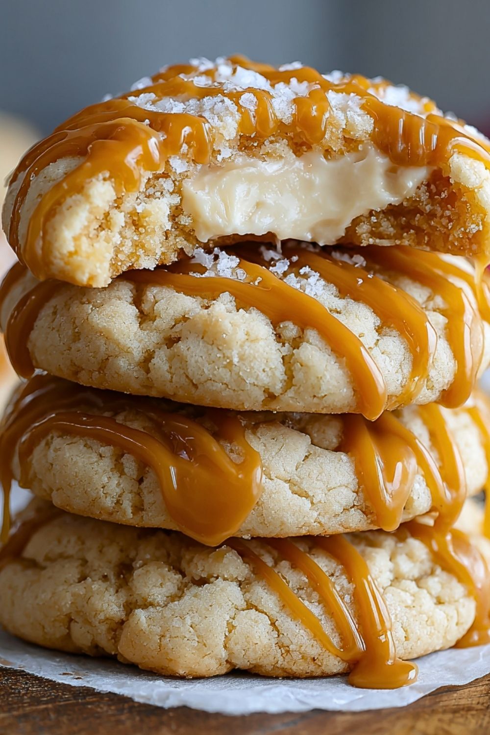 Let the cookies cool on the baking sheet for about 10 minutes before transferring to a wire rack. Once fully cooled, drizzle generously with caramel sauce. Sprinkle with sea salt flakes if using.