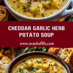 Keywords: cheddar potato soup, creamy soup, comfort food, easy dinner, garlic herb potato soup