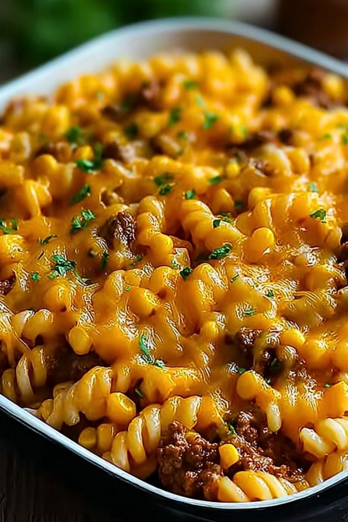 This Cheesy Beef and Sweet Corn Rotini Bake is pure comfort food layered with bold flavor, melty cheese, and hearty satisfaction. Imagine tender rotini pasta baked until golden, wrapped in a savory ground beef and tomato sauce, with pops of sweetness from sweet corn kernels. Then it’s finished with a generous blanket of melted cheddar that forms the irresistible topping—bubbling and golden brown from the oven.