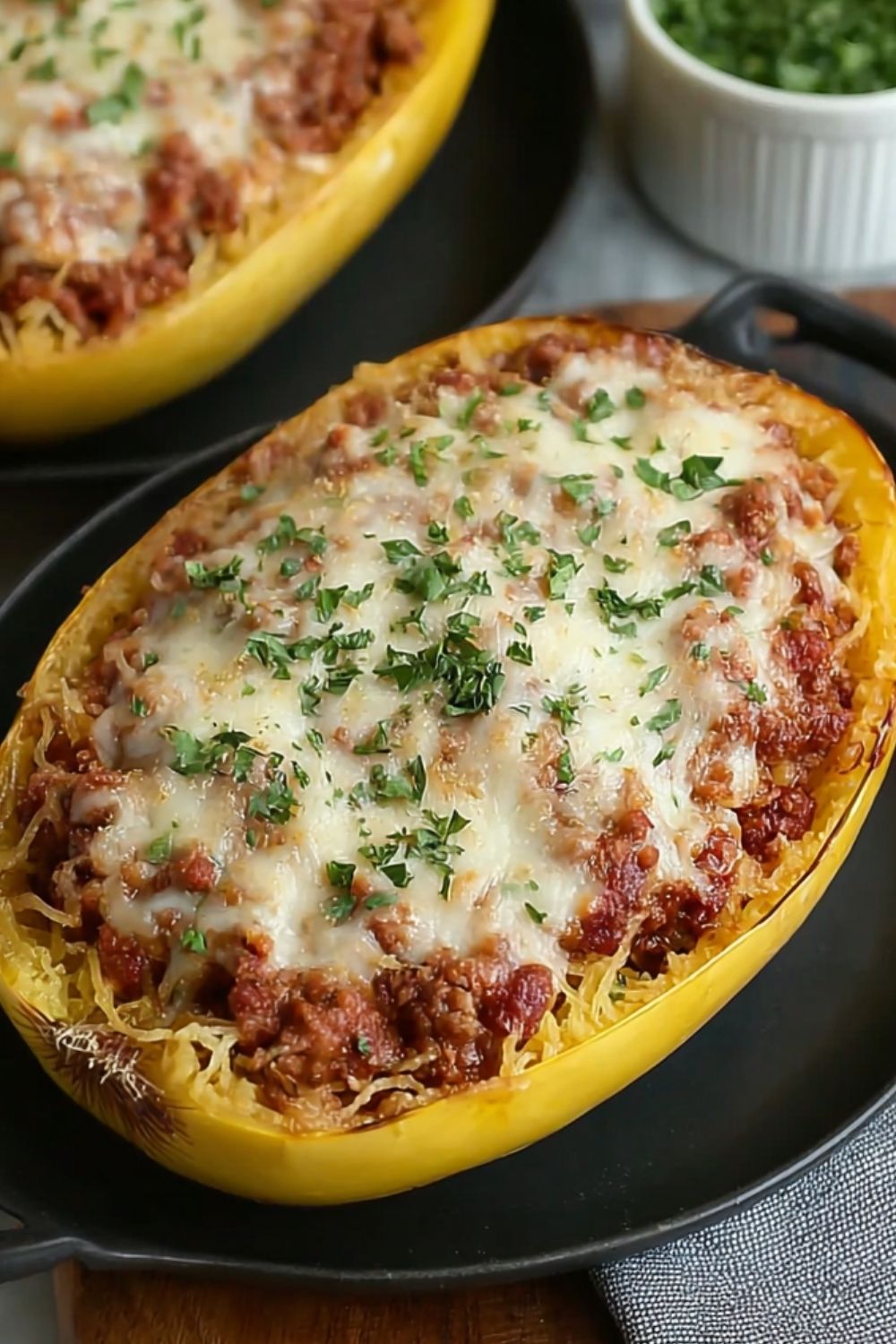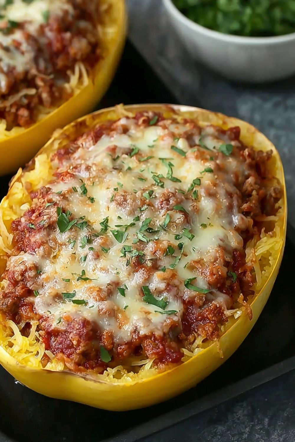 Cook Time: Roasting the spaghetti squash takes about 35–40 minutes. The meat sauce takes around 20 minutes, with some overlap. The final bake with cheese on top adds another 10–15 minutes, bringing the full cooking time to approximately 55–60 minutes.
