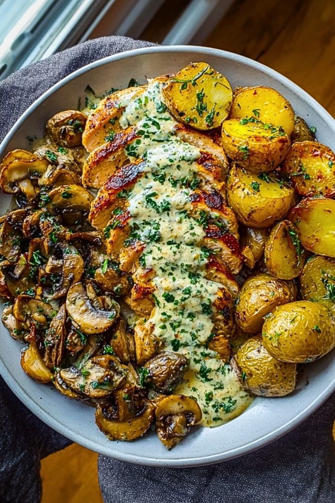 6. Slice the chicken and plate. Spoon Alfredo sauce over it. Add roasted potatoes and pesto mushrooms. Garnish with parsley or lemon zest if desired.