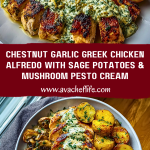 Chestnut Garlic Greek Chicken Alfredo with Sage Potatoes & Mushroom Pesto Cream is more than a meal — it’s a deeply satisfying fusion of Mediterranean comfort and creamy indulgence. The nutty garlic marinade adds depth to juicy chicken, balanced perfectly by silky Alfredo and earthy mushroom pesto. Each element is comforting yet bright, rustic yet elevated.