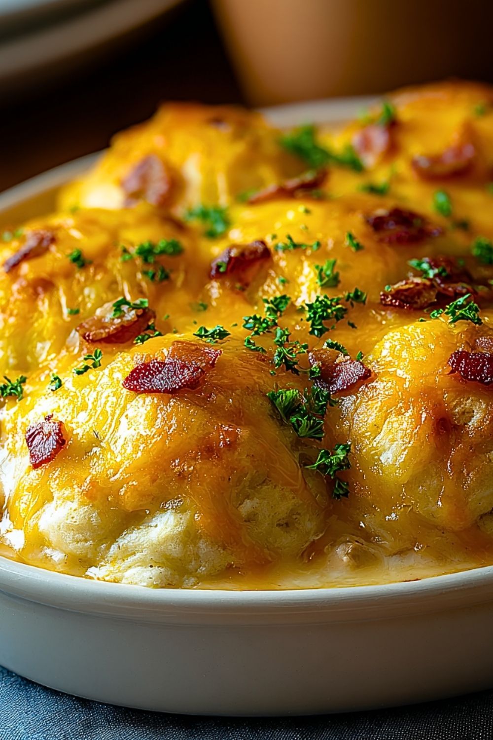 Cooking Time: The casserole bakes for 30 to 35 minutes at 350°F. You’ll want the biscuits to puff up and turn golden on top while the inside becomes bubbly and creamy. Let it cool for 5 minutes before serving.