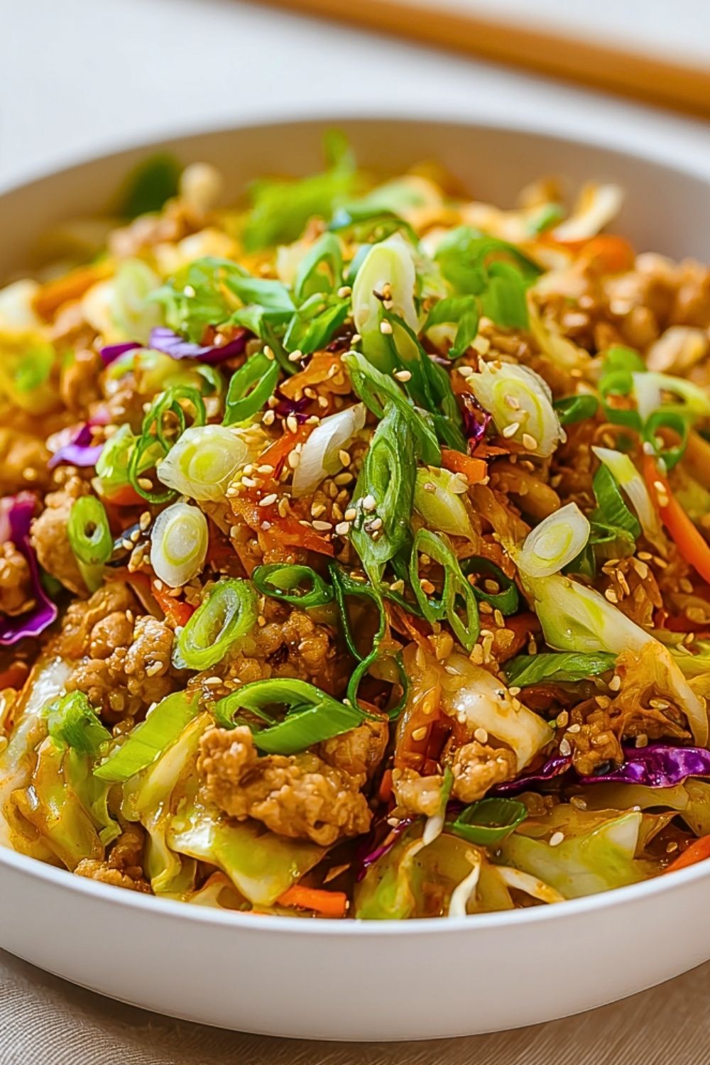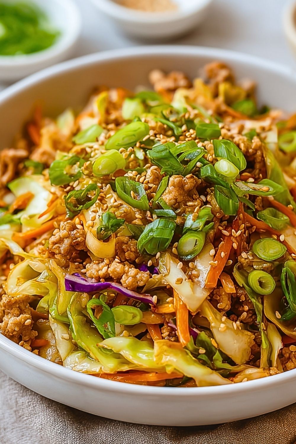 One of the best parts about Chicken Egg Roll in a Bowl is how easy it is to customize. If you don’t have ground chicken, you can swap it with ground turkey, pork, or even beef for a richer flavor.
