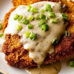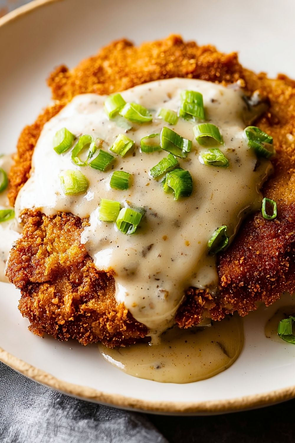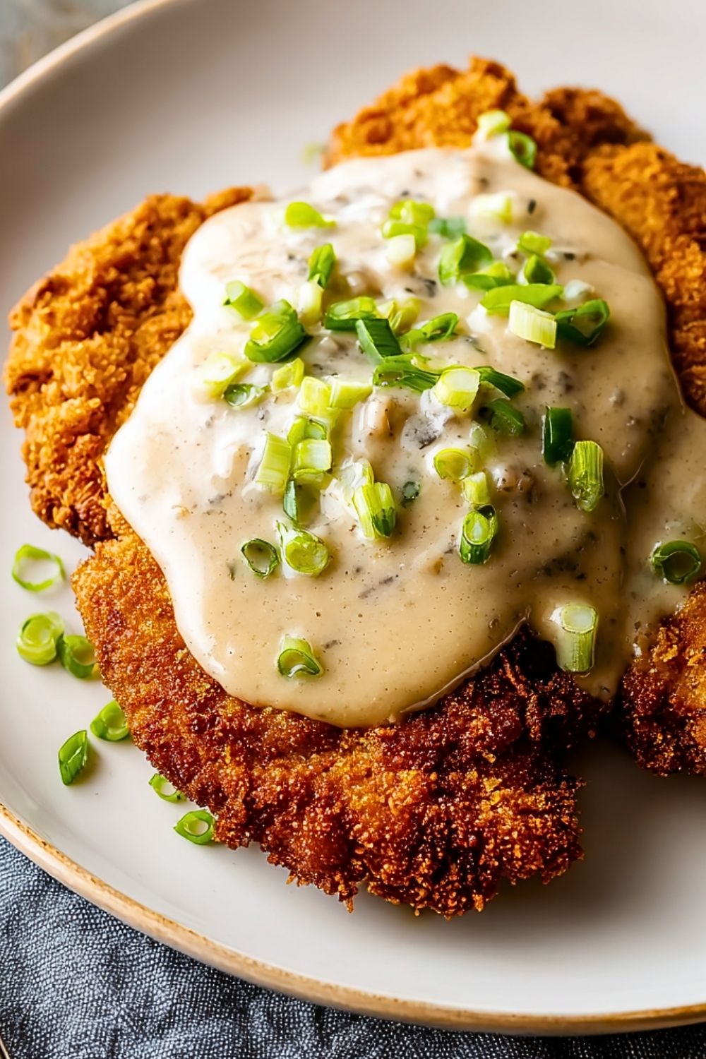 Plate the crispy steaks and pour the hot gravy generously over the top. Garnish with chopped green onions for a pop of color and a bit of freshness. Serve immediately while the steak is crisp and the gravy is warm and creamy.