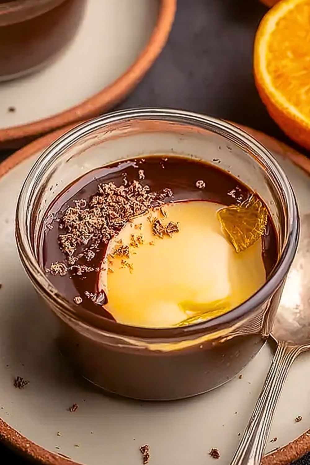 When zesting the orange, be careful to only get the brightly colored outer skin — avoid the bitter white pith underneath. Heat the cream mixture gently and don’t let it boil over; a slow simmer extracts the citrus oils and activates the cream’s natural thickening properties. Once you add the orange juice, stir well but gently to avoid curdling. Always strain before pouring into serving dishes for the silkiest result. When adding the ganache, wait until the possets are fully set to keep the layers clean. Chill for at least four hours, but overnight is even better for maximum flavor fusion.