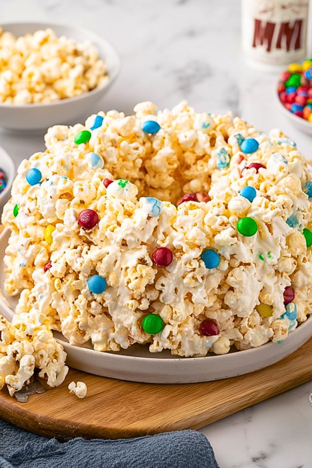 Let the mixture cool for a minute or two so the M&M’s don’t melt. Then fold in the M&M’s gently so they’re evenly distributed throughout the popcorn.
