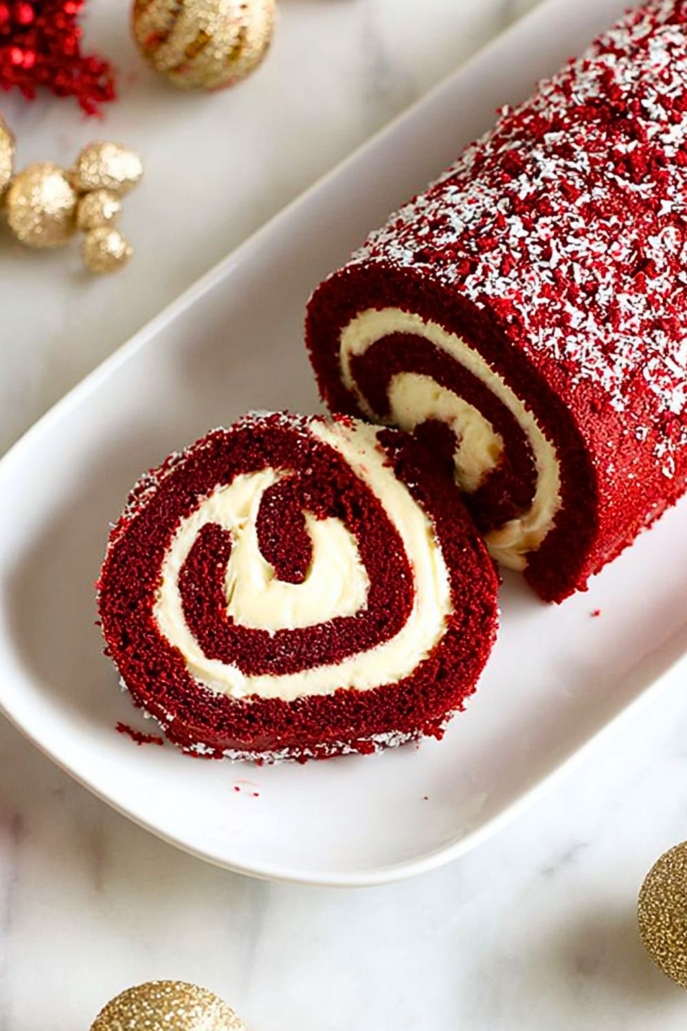Keywords: red velvet roll, holiday dessert, Christmas cake, easy recipe, festive dessert