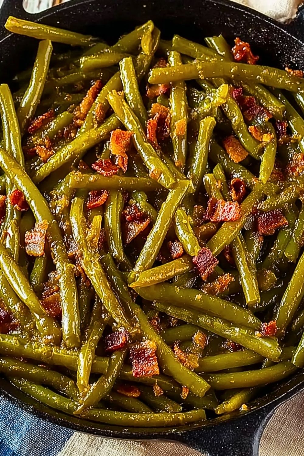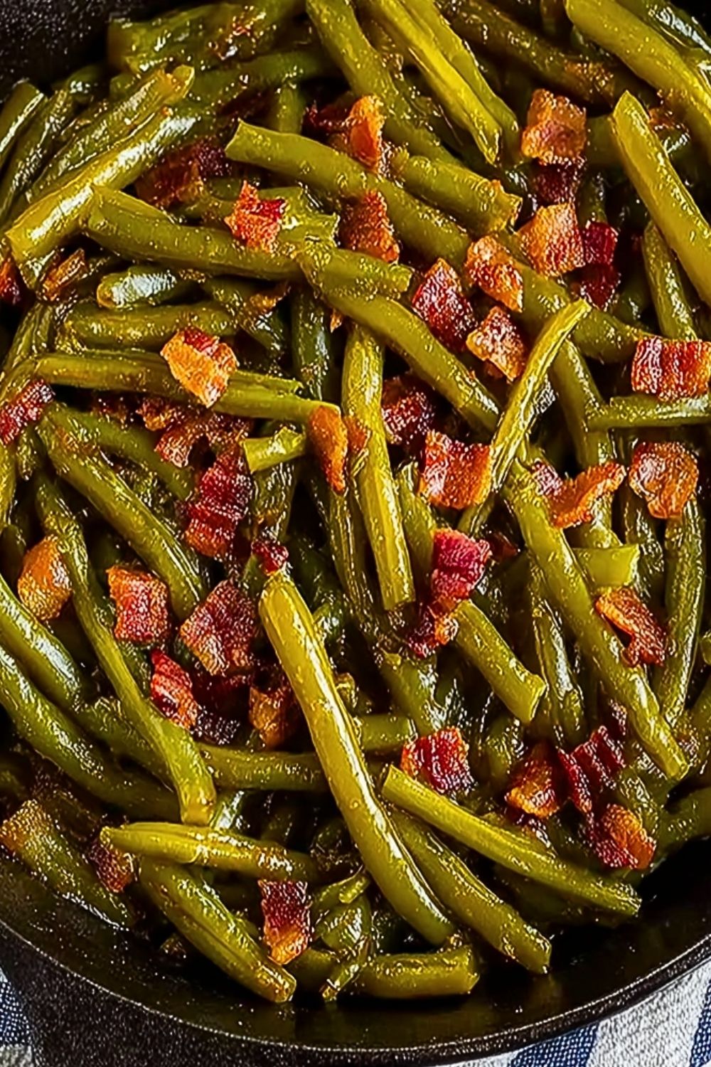 Once the green beans are tender and infused with flavor, taste and adjust seasoning with salt if needed. Return the cooked bacon to the skillet and stir to combine. Allow it to simmer uncovered for 5 more minutes so the bacon rewarms and the broth reduces slightly. Serve warm straight from the skillet or transfer to a serving dish.