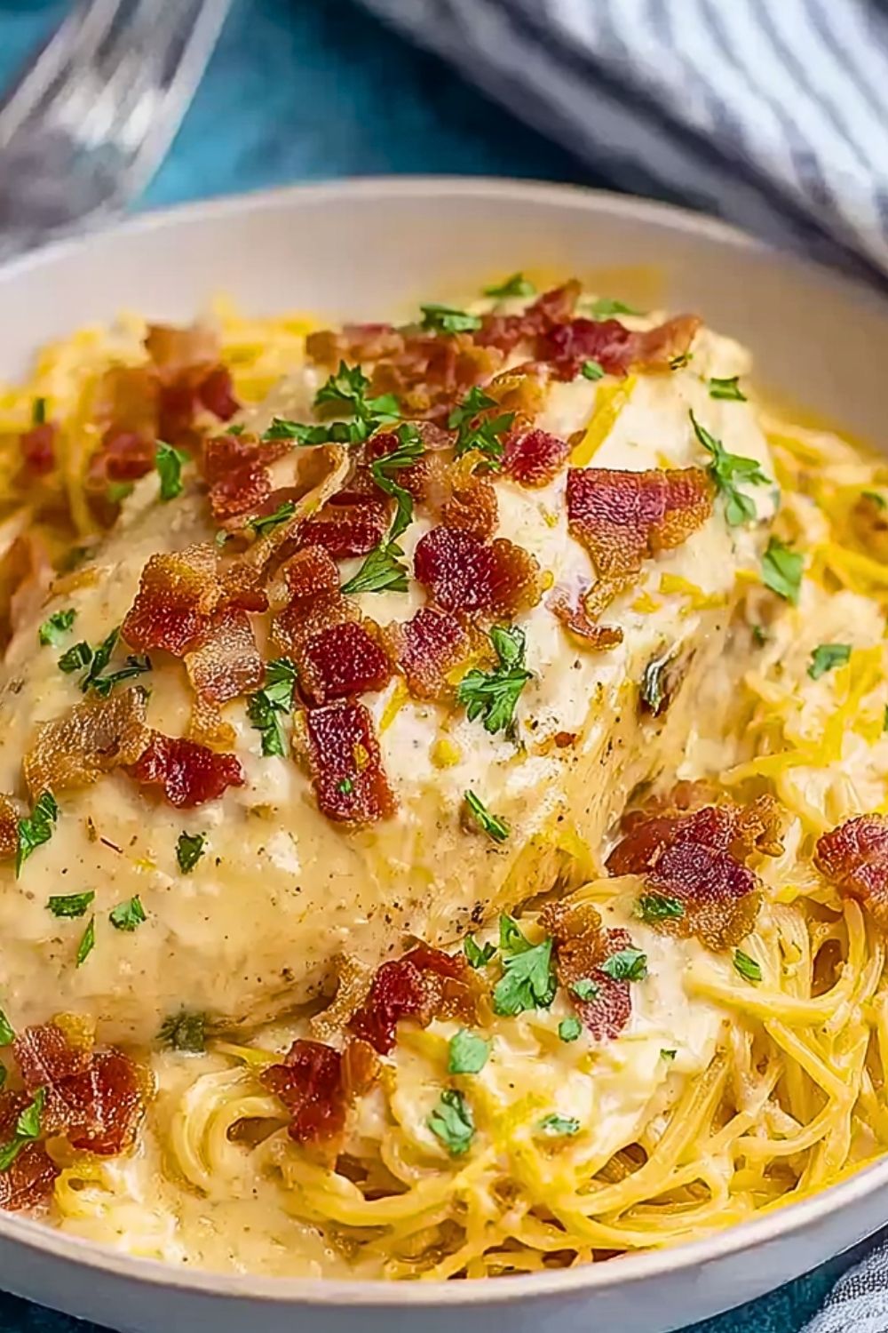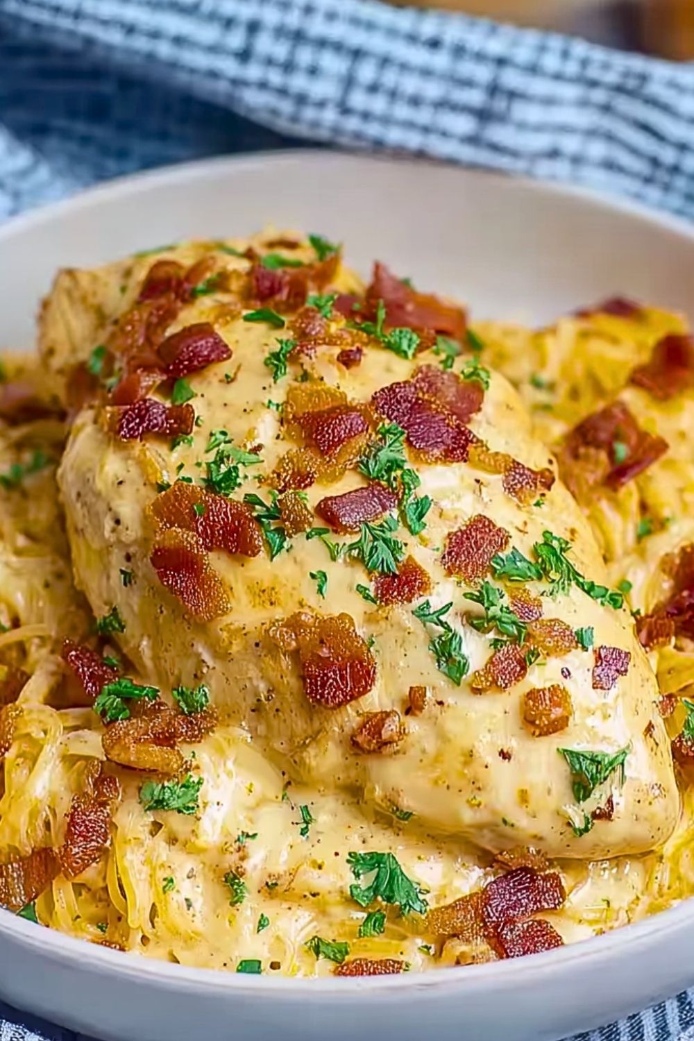 Start with room-temperature cream cheese so it melts smoothly into the sauce. For best results, cook the chicken on low for about 6 hours—this allows the flavors to really develop. Don’t skip the bacon—it adds a salty, smoky crunch that cuts through the richness. You can use pre-cooked bacon bits to save time, but freshly cooked bacon is always more flavorful. Lastly, wait to shred the chicken until the end of cooking to keep it juicy and tender.