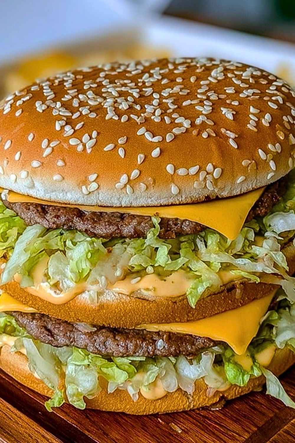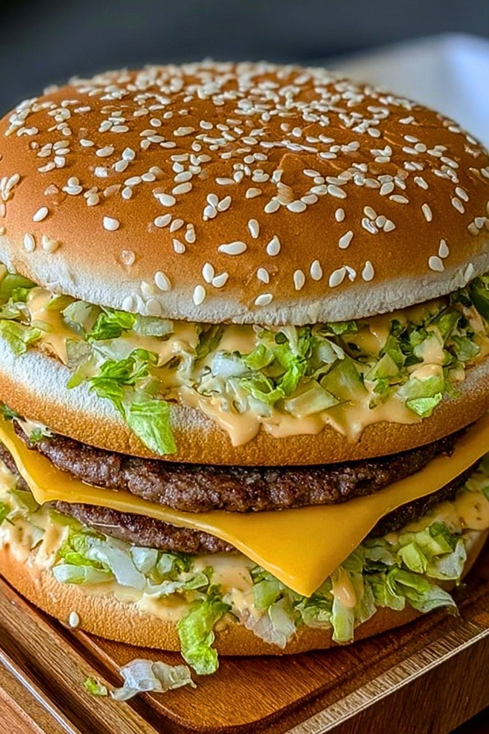 Craving that iconic fast-food taste without leaving your kitchen? This Copycat McDonald’s Big Mac brings you all the nostalgia and satisfaction of the original, stacked with two juicy beef patties, shredded lettuce, tangy pickles, American cheese, and that famous creamy Big Mac sauce—all layered between three toasted sesame seed buns. Perfect for easy dinner ideas, burger night, or when you want fast-food flavor with homemade freshness.