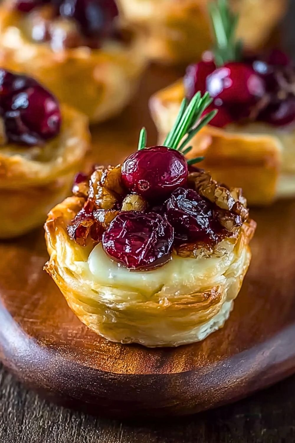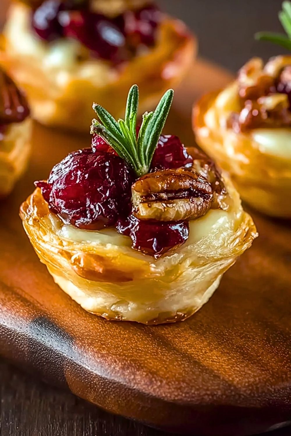 These Cranberry Brie Bites are a quick and crowd-pleasing appetizer perfect for the holidays or any gathering. Creamy brie is nestled in flaky puff pastry, topped with sweet-tart cranberry sauce and toasted pecans, and finished with a sprig of rosemary for a festive touch. Whether you’re searching for holiday appetizers, quick breakfast ideas, or elegant food ideas for entertaining, this easy recipe is a must-try!