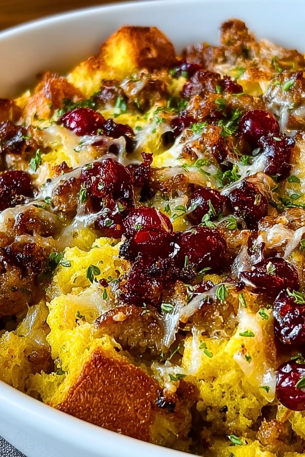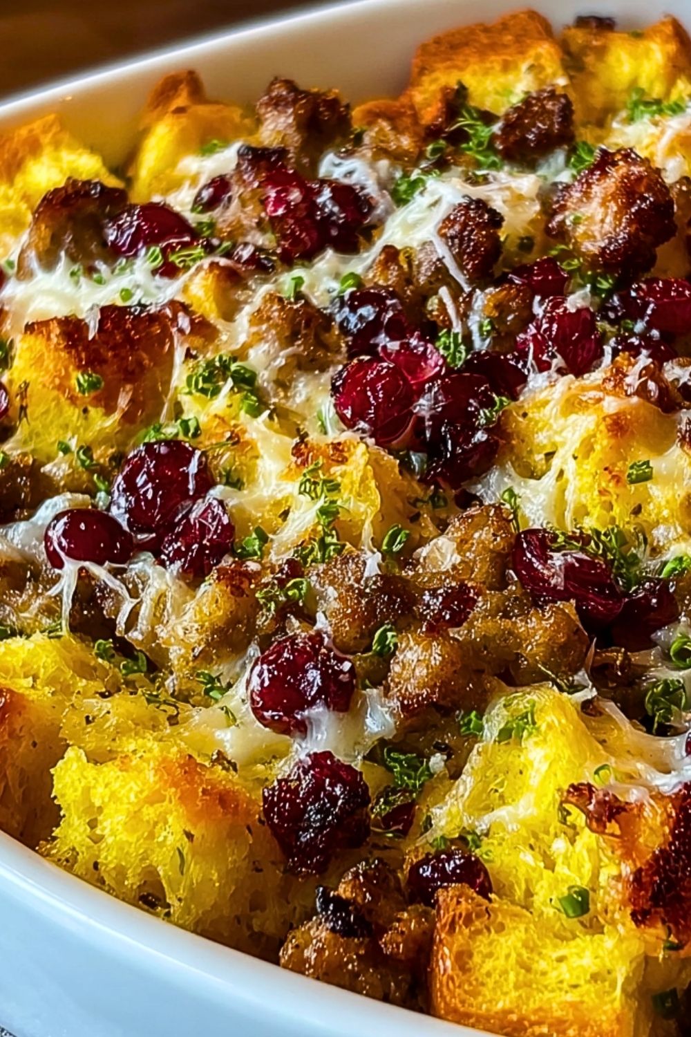 Slice into portions and serve warm. Each bite should deliver a perfect mix of savory sausage, tart cranberries, creamy custard, and crispy edges.