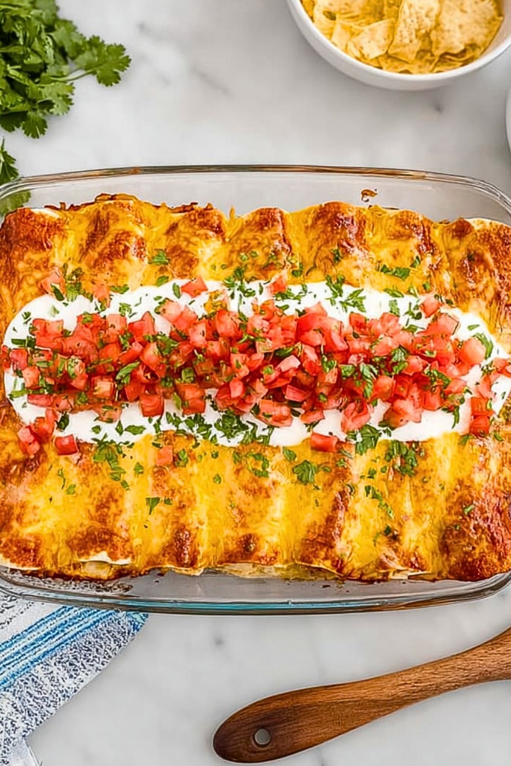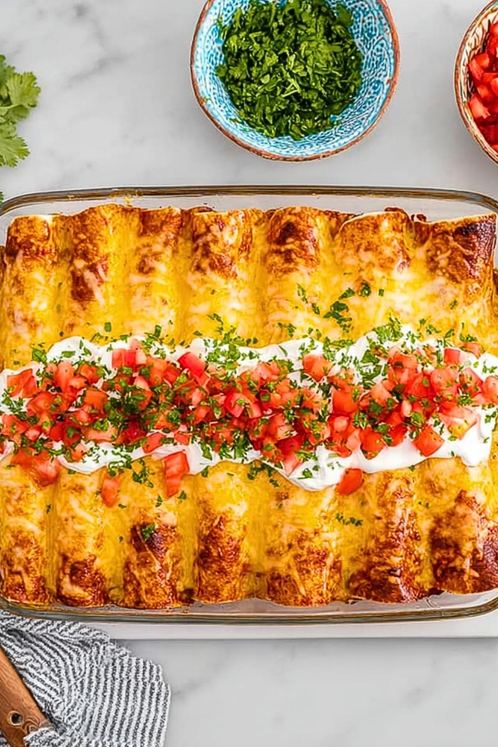 Remove the enchiladas from the oven and let them rest for 5–10 minutes. Top with sour cream, diced tomatoes or pico de gallo, and a sprinkle of chopped cilantro before serving.