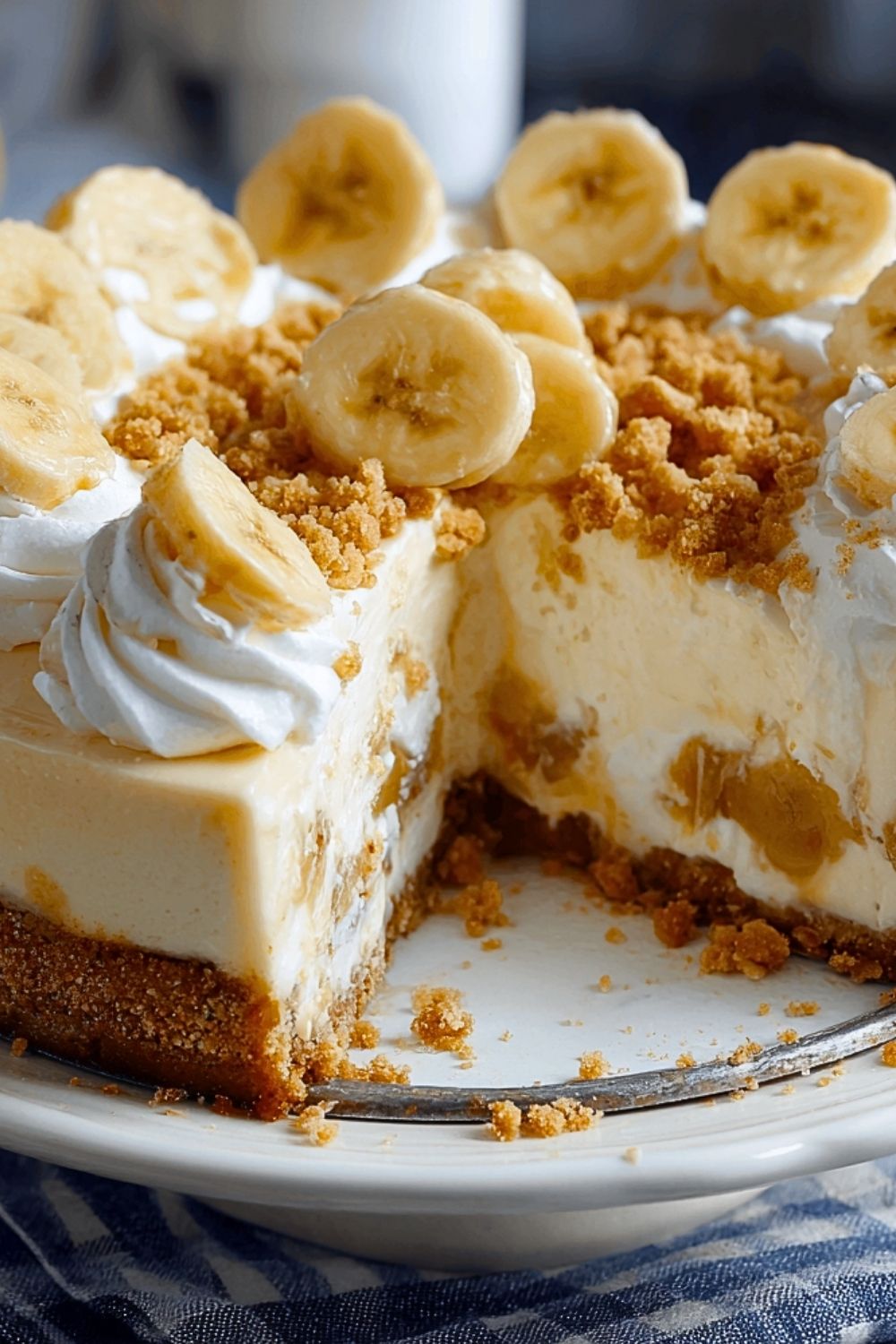Before serving, top the cheesecake with swirls of whipped topping, banana slices, and crushed vanilla wafers. Use a warm knife to cut clean slices and serve chilled.