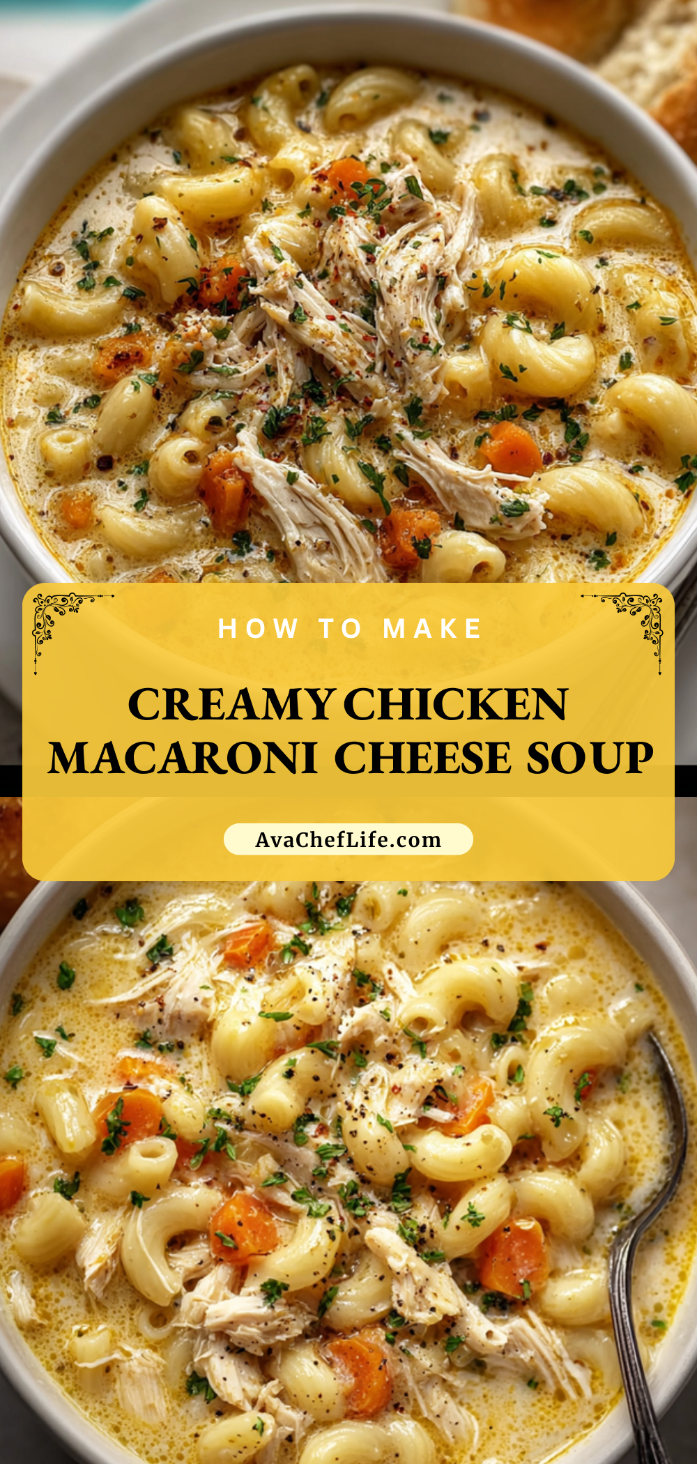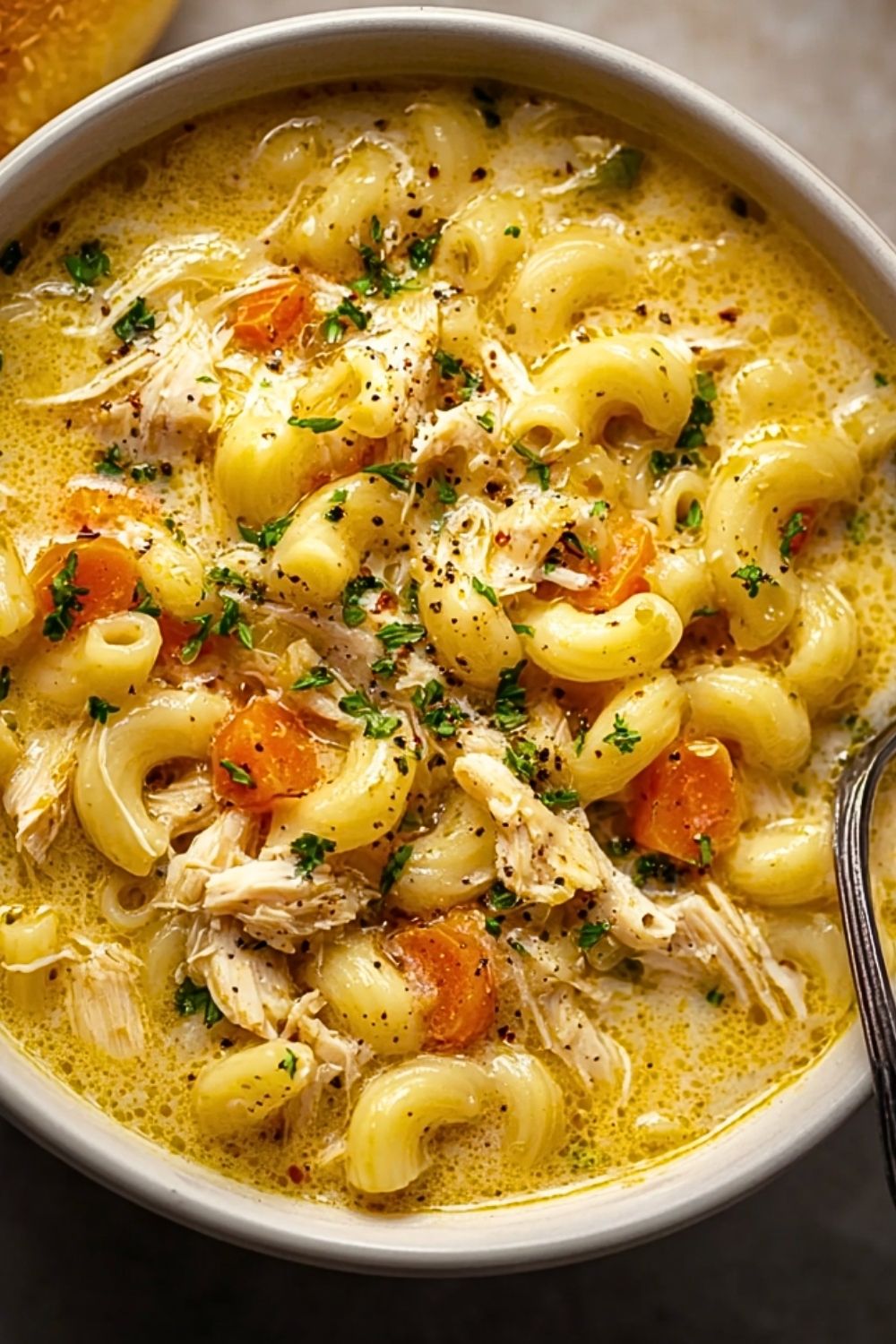 Keywords: creamy soup, chicken macaroni soup, easy dinner, comfort food, mac and cheese soup, quick dinner, fall recipes, winter soup