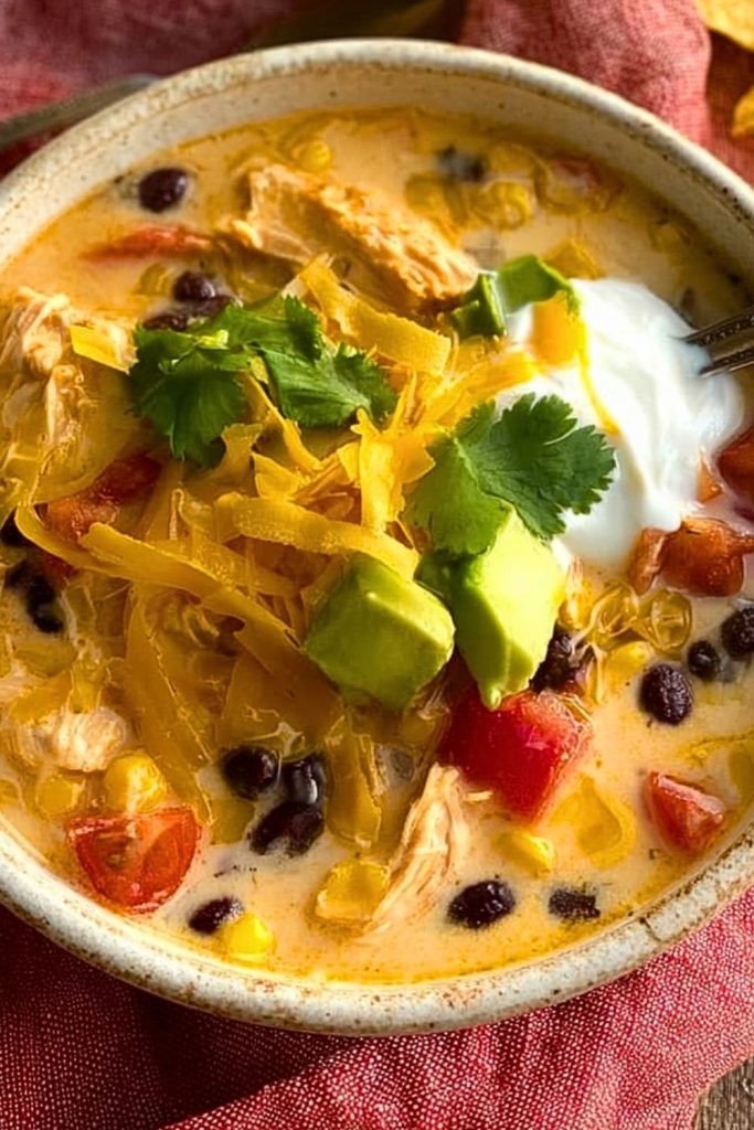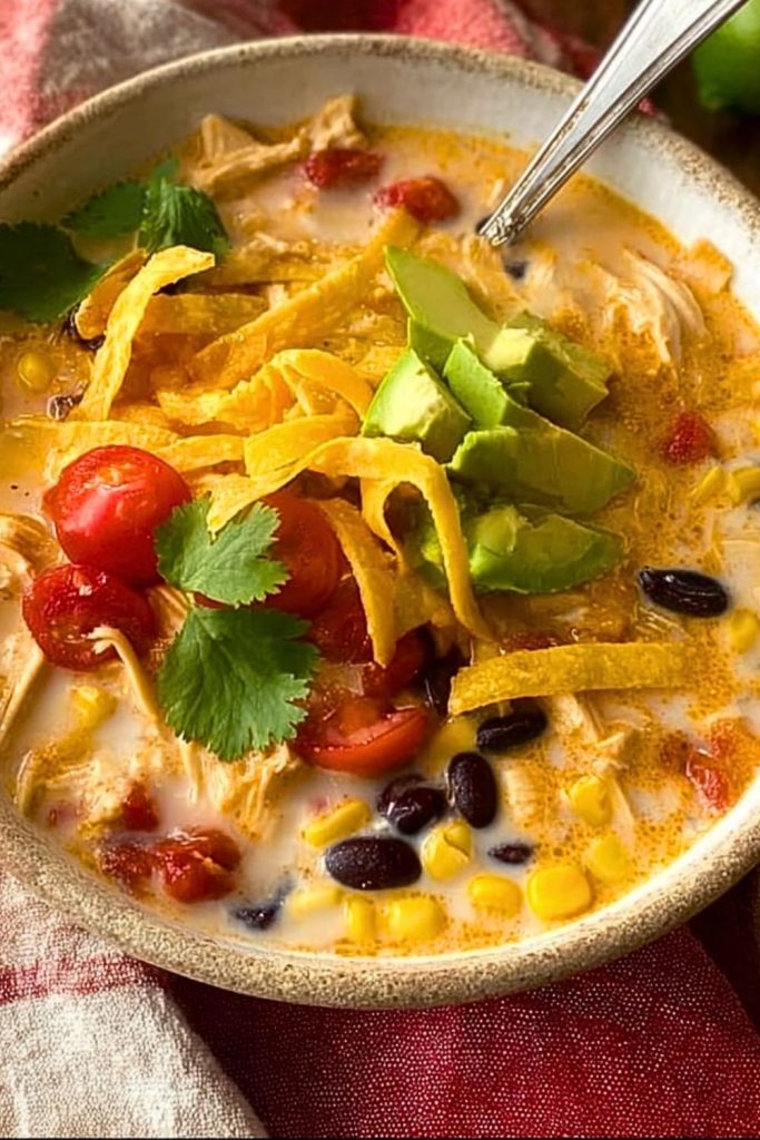 Creamy Chicken Taco Soup is a warm, comforting bowl of bold flavors and velvety texture, perfect for chilly nights or when you’re craving a hearty yet easy-to-make meal. It combines tender shredded chicken with sweet corn, black beans, juicy tomatoes, and a luscious, cheesy cream base. Topped with crunchy tortilla strips, ripe avocado, and fresh cilantro, this soup is as satisfying as it is colorful.