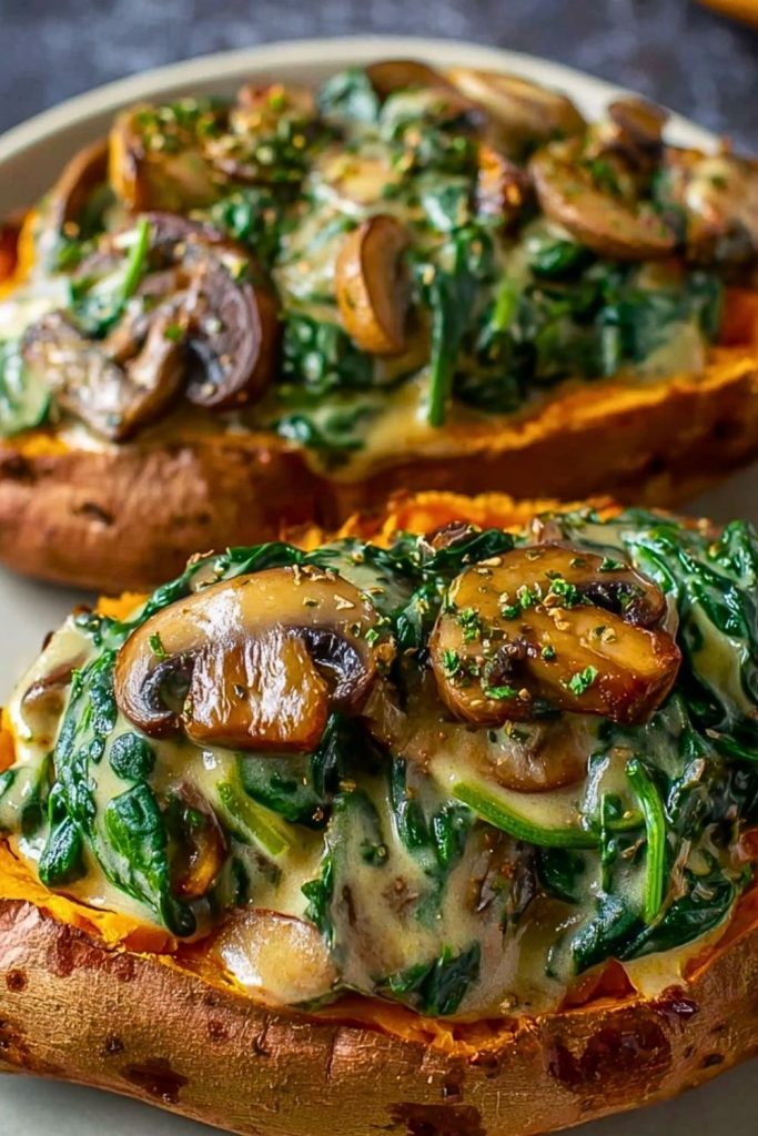 This dish is a perfect mix of indulgence and nutrition. You get the sweetness and fiber-rich benefits of sweet potatoes paired with a savory, creamy mushroom-spinach filling that’s downright addictive. It’s also: