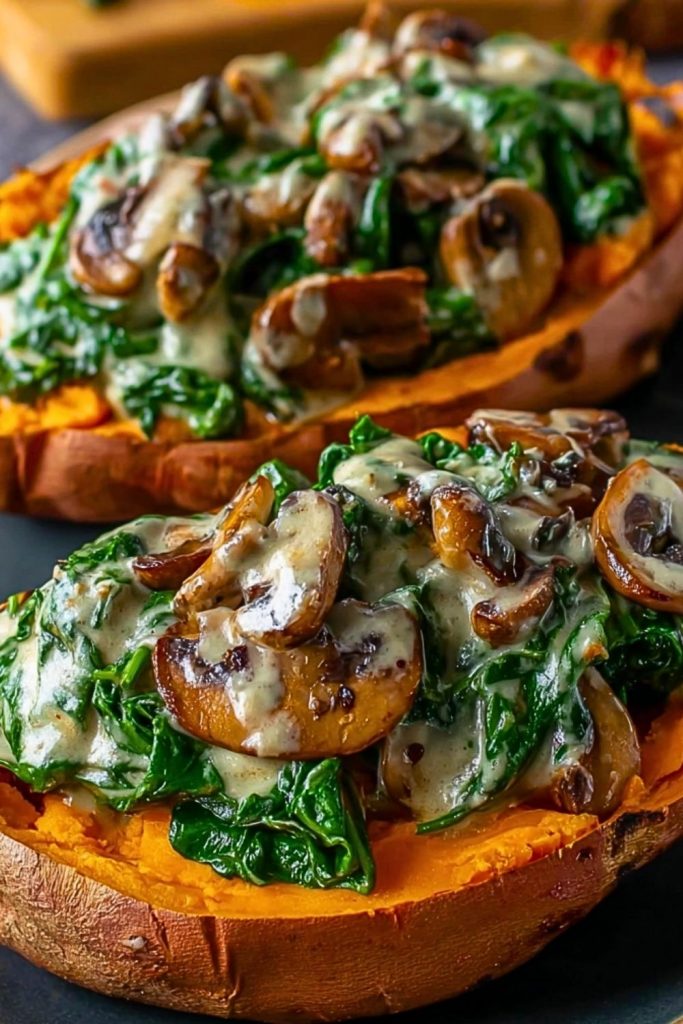 Creamy Mushroom and Spinach Stuffed Sweet Potatoes
