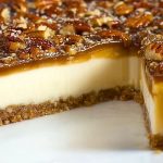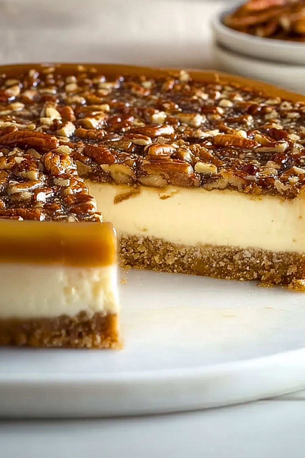 For a crust that holds its shape and doesn’t get soggy, press the graham cracker mix down firmly with the bottom of a measuring cup. Always use room temperature cream cheese to avoid lumps in the filling. Don’t rush the cooling process—let the cheesecake sit in the oven (turned off) for an hour after baking to prevent cracking. And finally, let the pecan topping cool just slightly before pouring it over the cheesecake—it should be warm and pourable, not boiling hot.