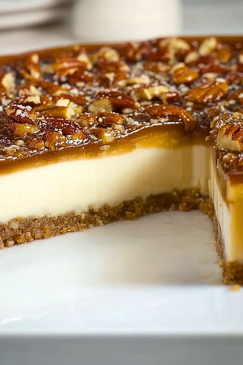 Once the cheesecake is fully chilled, pour the slightly cooled pecan topping over the surface. Spread evenly with a spoon or offset spatula. Refrigerate for another 30 minutes to set the topping before serving.