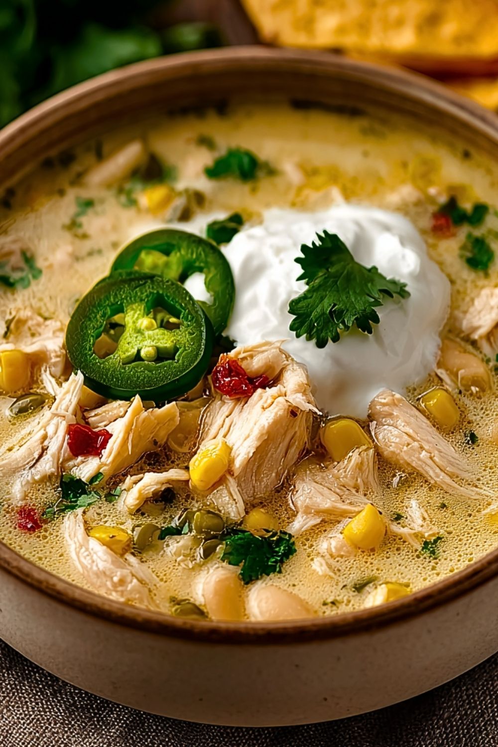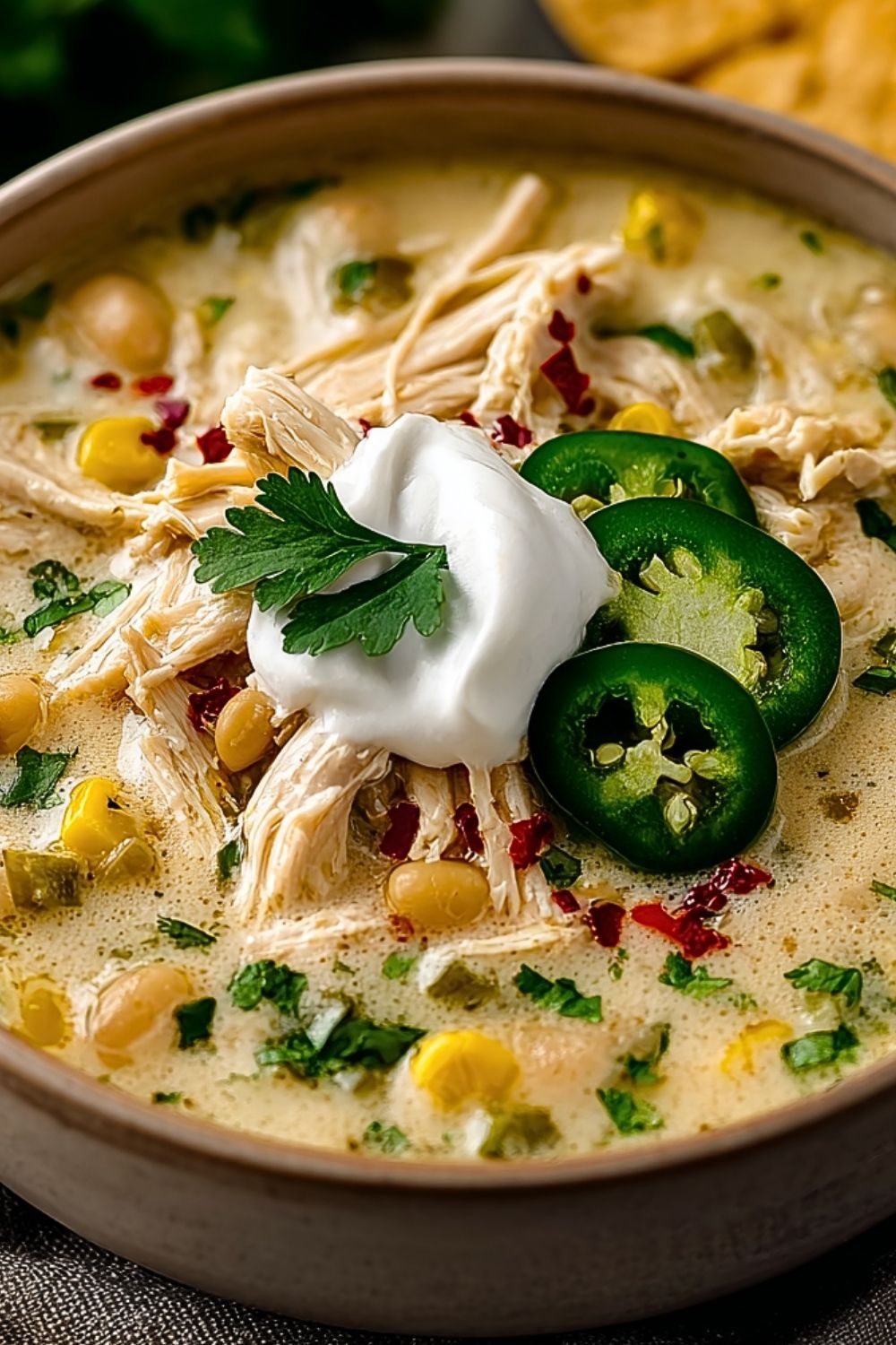 Ladle the creamy chili into bowls and top with fresh cilantro. Optional toppings include shredded cheese, tortilla strips, avocado slices, or a dollop of extra sour cream.