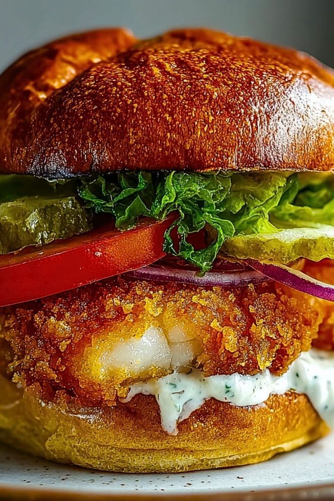 The Crispy Fried Cod Sandwich is a mouthwatering combination of crunchy golden cod, buttery toasted brioche buns, fresh vegetables, and zesty tartar sauce. The cod is battered and fried until crisp outside and tender inside, then layered with tangy pickles, juicy tomato, and crisp lettuce. It’s the perfect go-to for casual lunches, fish Fridays, or weekend treats—flavor-packed and easy to make at home.