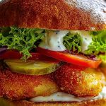 The Crispy Fried Cod Sandwich is a masterclass in balancing bold textures and refreshing flavors. Nestled between a perfectly toasted brioche bun lies a golden, crunchy fillet of cod—its batter light, crisp, and satisfying with every bite. Layered on top are juicy slices of tomato, crunchy dill pickles, and fresh leafy lettuce, all harmonized with a creamy, herb-packed tartar sauce that adds just the right tang.