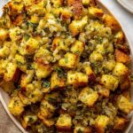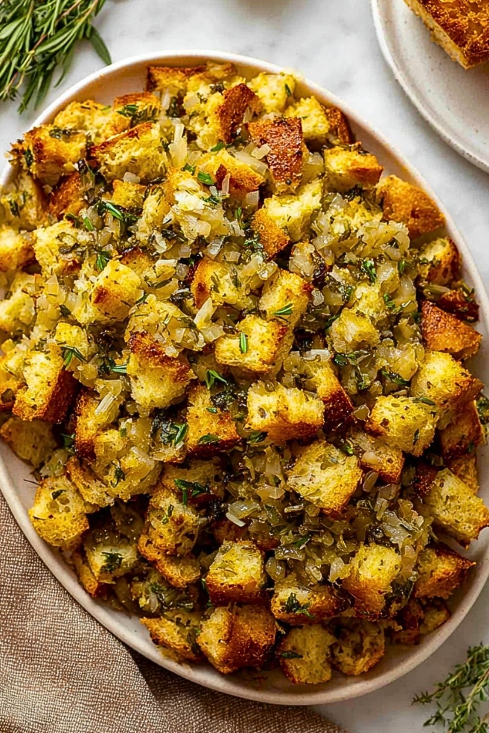 This stuffing strikes the perfect balance between crispy and tender. The edges get beautifully golden and crunchy, while the inside remains moist and flavorful. It’s packed with savory onions, fresh herbs like sage and rosemary, and just enough butter to make everything rich without being greasy. It’s also easy to prep ahead, making it perfect for big holiday meals when oven space is tight.