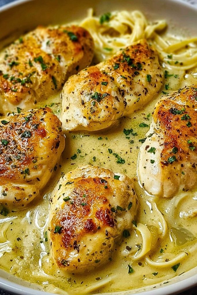 - Boneless, skinless chicken breasts: These are the stars of the dish — tender and juicy once slow-cooked in the creamy sauce.