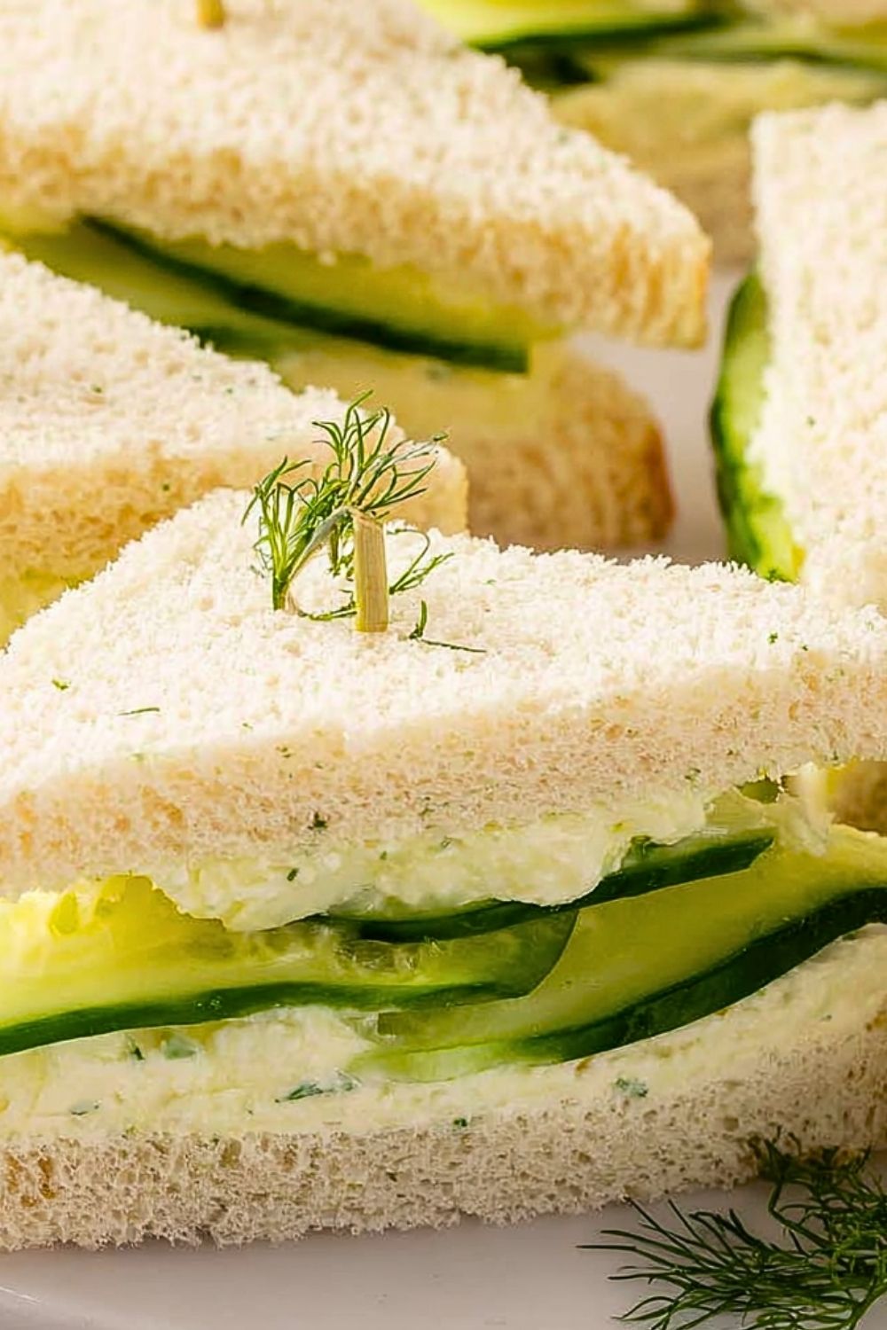 Cut each sandwich into halves or quarters, either in triangles or rectangles, depending on your preference. Garnish with a small sprig of dill or a thin cucumber wedge for presentation if desired.