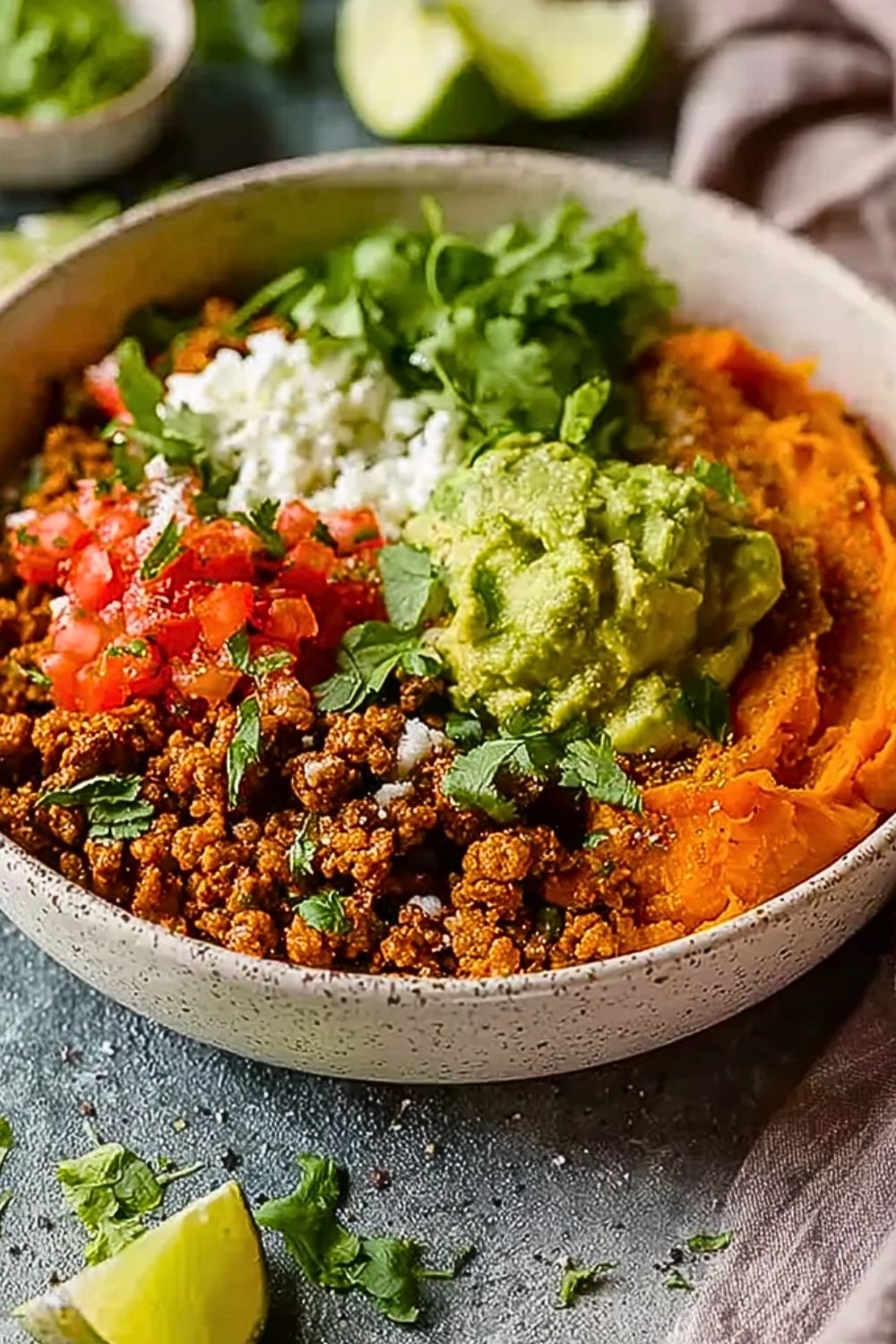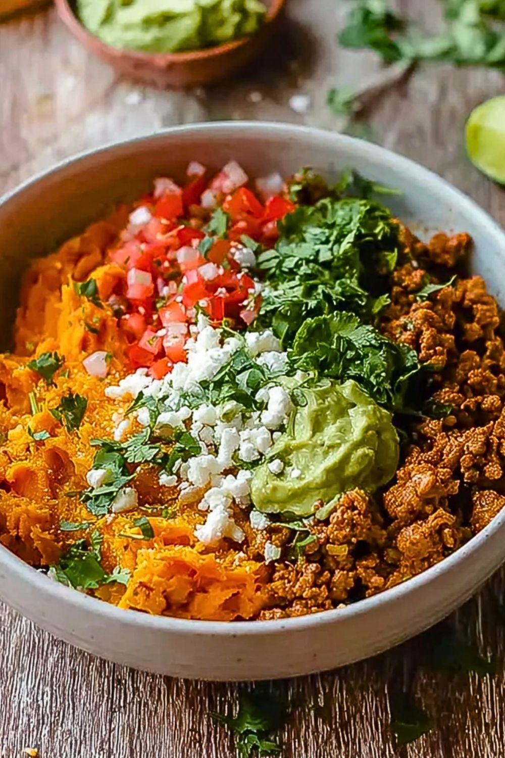 Packed with bold, wholesome flavors, this Ground Turkey Sweet Potato Bowl is the perfect harmony of savory, creamy, and fresh elements. Tender roasted sweet potatoes form a naturally sweet base, topped with seasoned ground turkey, cool and zesty Greek yogurt sauce, a scoop of vibrant guacamole, fresh pico de gallo, and a sprinkle of tangy feta. It’s a satisfying and nutrient-rich bowl that hits every craving—from comforting to refreshing—in one bite.