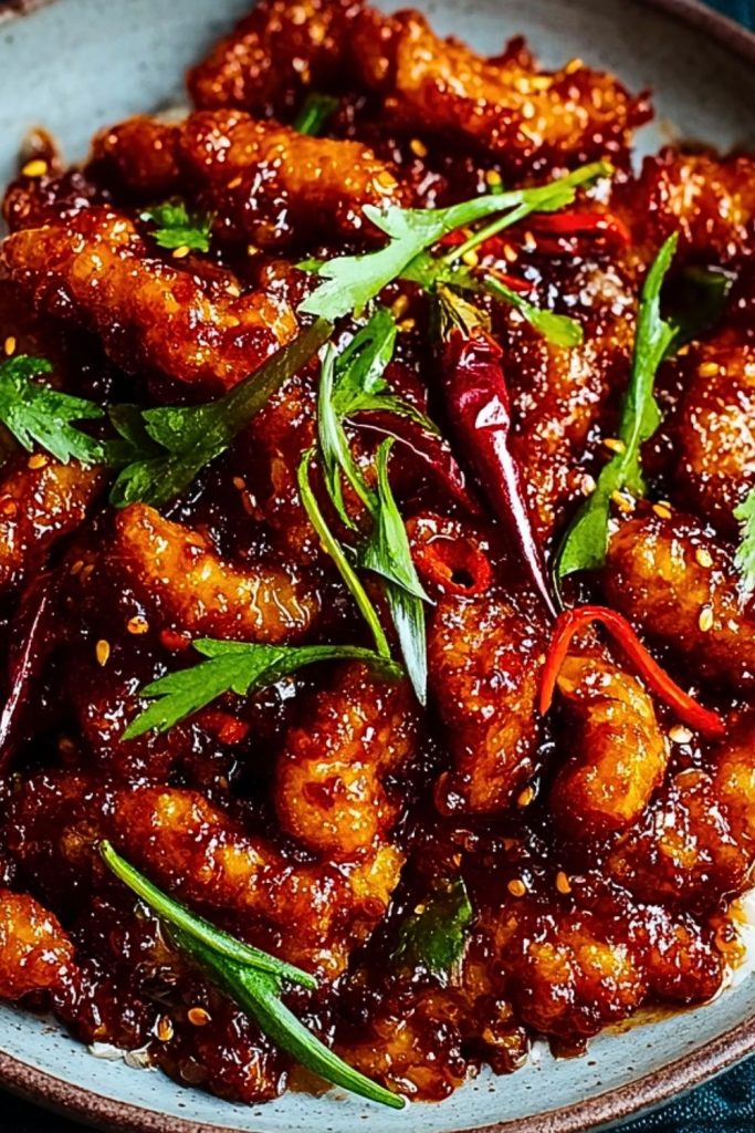 Fiery, crispy, and irresistibly saucy — Dragon Chicken is a bold Indo-Chinese fusion dish that turns up the heat and flavor with every bite. Coated in a deep red glaze that balances spicy, sweet, and savory notes, the tender strips of fried chicken become the star of any dinner table. Garnished with chilies and spring onions, it’s as visually striking as it is mouthwatering.