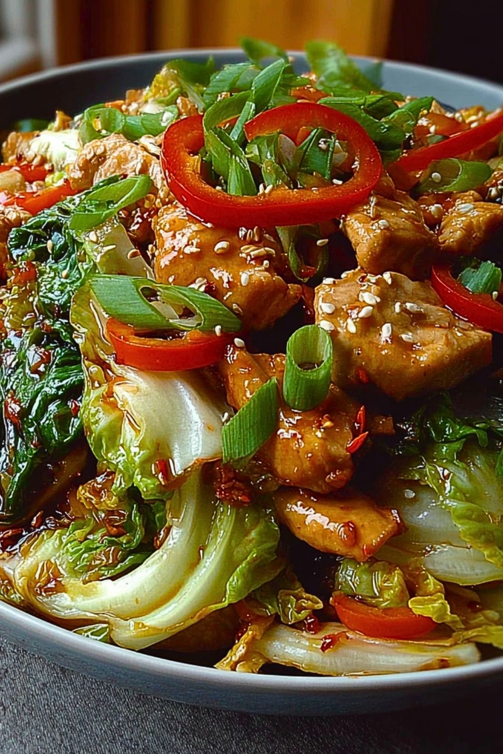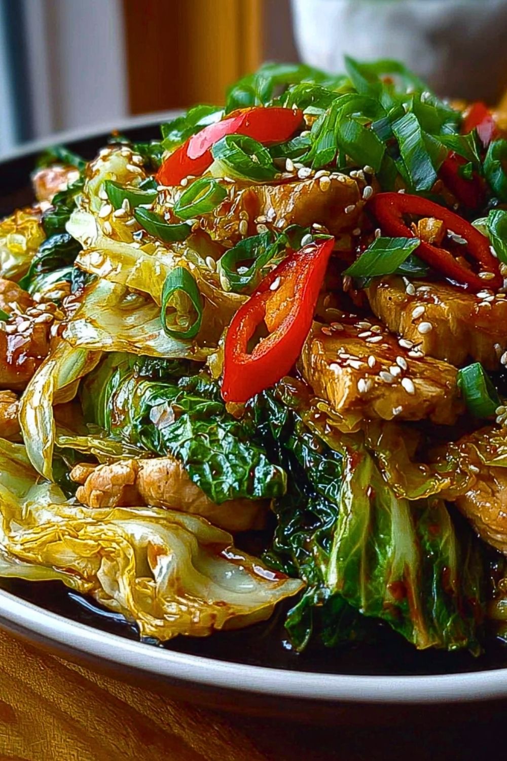 Let it cook for another 2–3 minutes until the sauce thickens and clings to the chicken and cabbage. The cornstarch will activate and create a glossy finish.