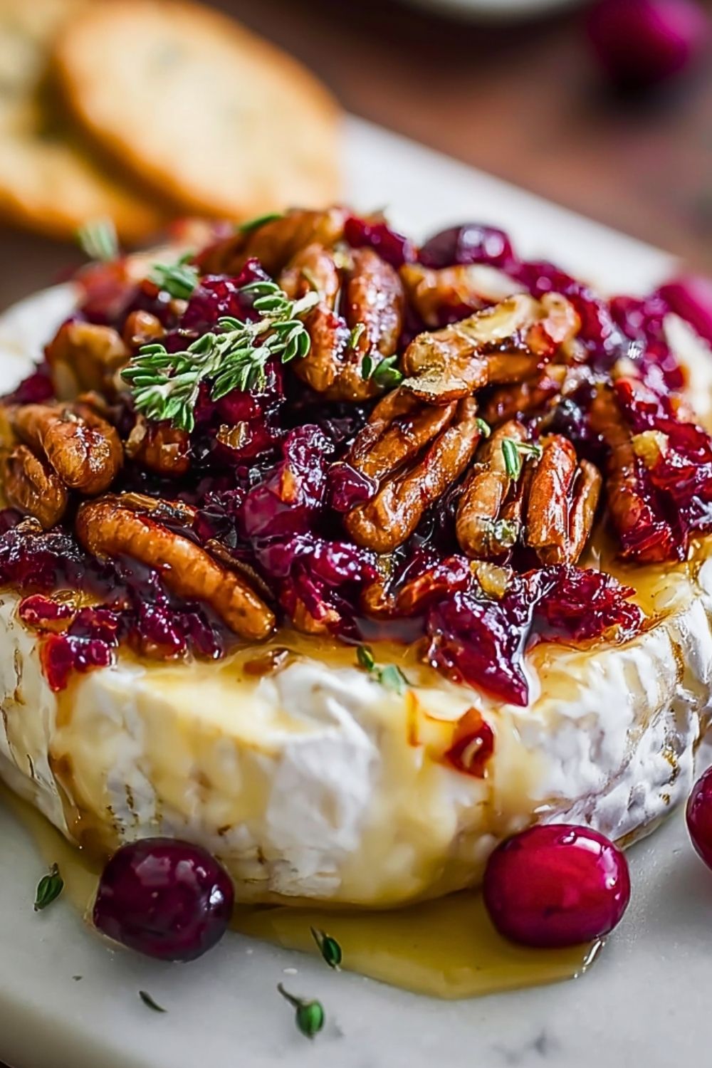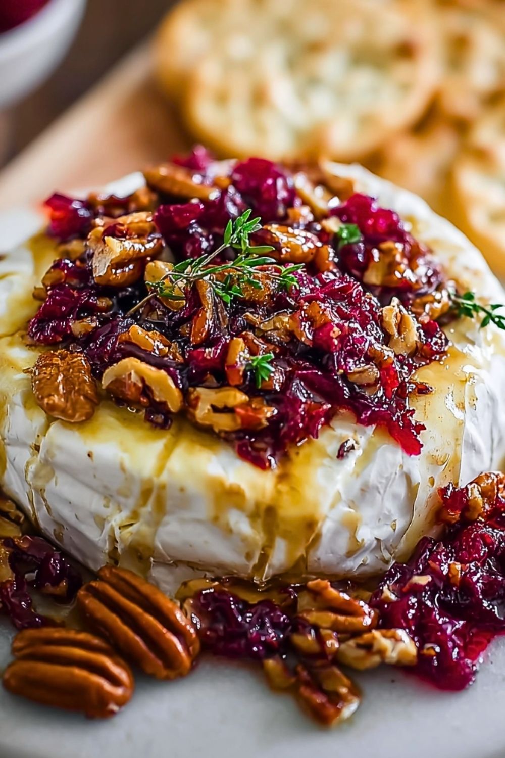 Let the brie sit at room temperature for about 10 minutes before baking—this helps it soften evenly. Lightly score the top of the brie rind in a criss-cross pattern to allow heat to penetrate and make it easier to scoop once baked. Toasting the pecans for a few minutes before adding them intensifies their flavor and adds a wonderful crunch. When melting the cranberries and honey together, keep the heat low to avoid burning. Assemble the topping before baking if you prefer a more caramelized finish, or spoon it over after baking for a fresher texture. Finally, garnish with fresh herbs like thyme or rosemary for an aromatic touch.