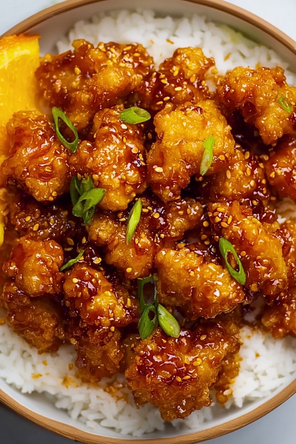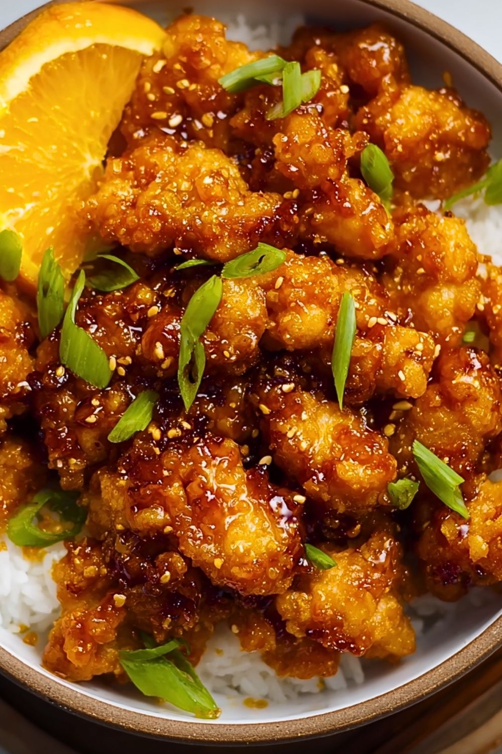 The vibrant orange glaze clings to each crunchy piece, while hints of garlic, ginger, and soy bring depth to the flavor. Finished with a sprinkle of sesame seeds and fresh green onions, this dish is not only delicious but visually irresistible—perfect for a quick dinner or impressing guests.