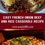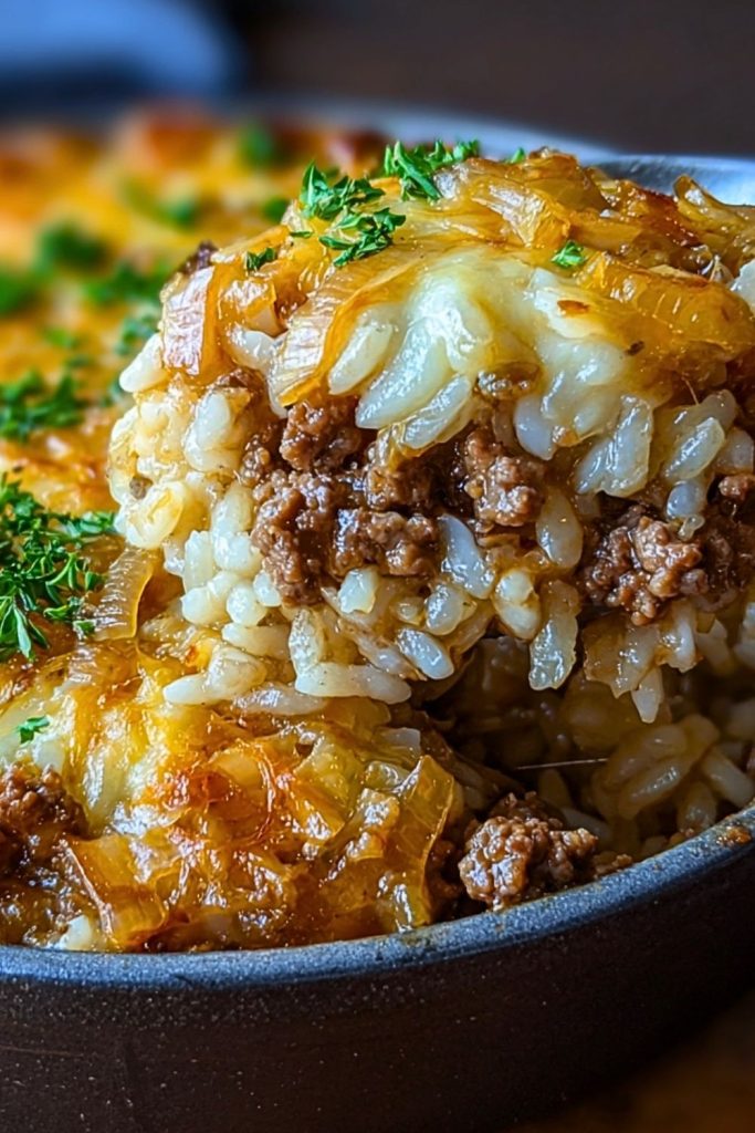 Keywords: easy dinner, ground beef casserole, French onion recipe, comfort food, baked rice dish