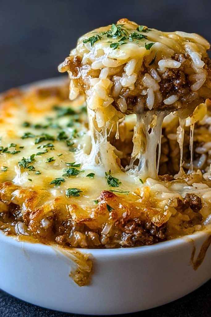 This Easy French Onion Beef and Rice Casserole is the kind of comforting, hearty dinner that brings everyone to the table with excitement. Imagine fork-tender seasoned ground beef, soft buttery rice, sweet caramelized onions, and rich, melty cheese—all baked together in one bubbling, golden-topped dish. It’s a beautiful marriage of flavors: the savory depth of French onion soup meets the ease of a weeknight casserole.