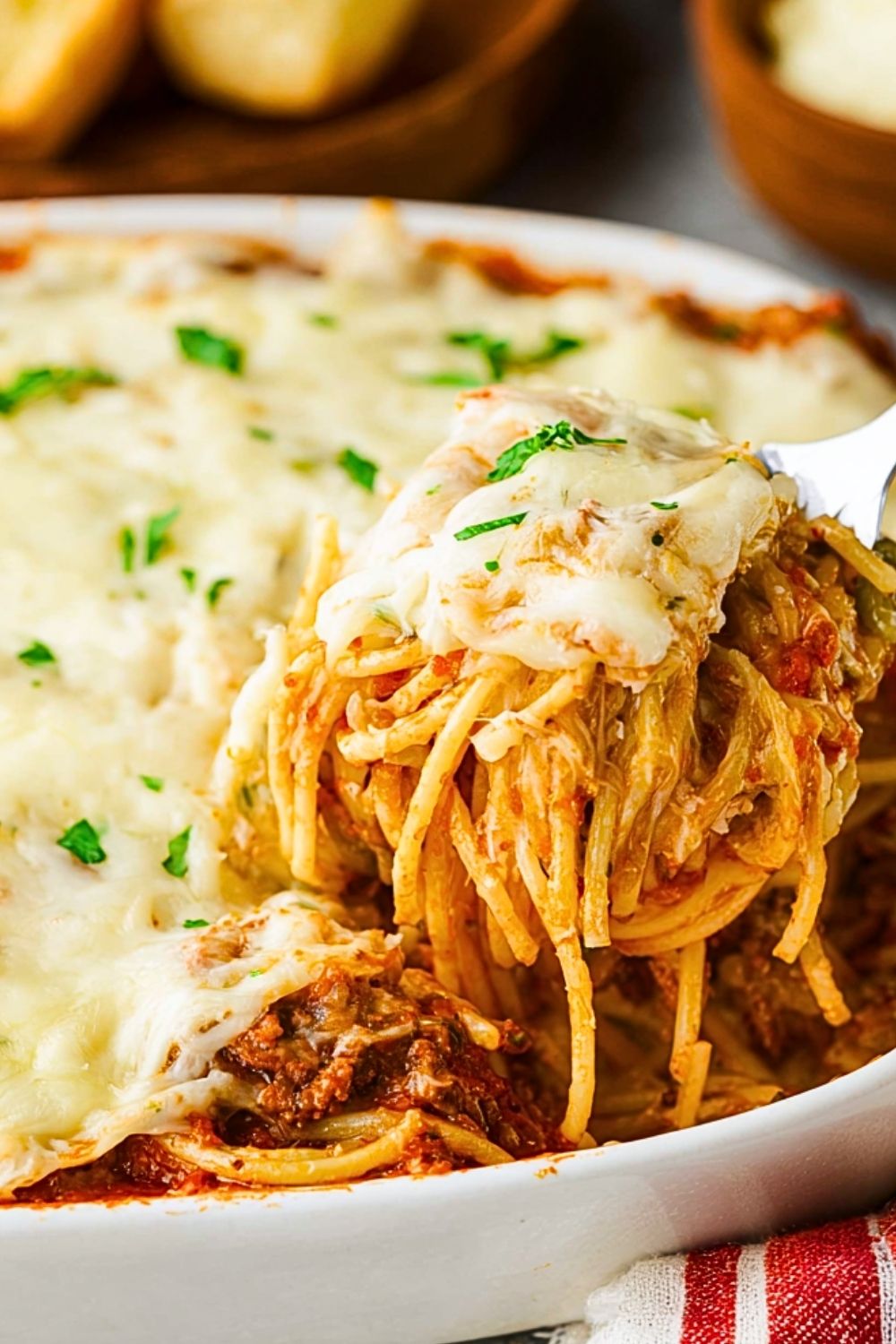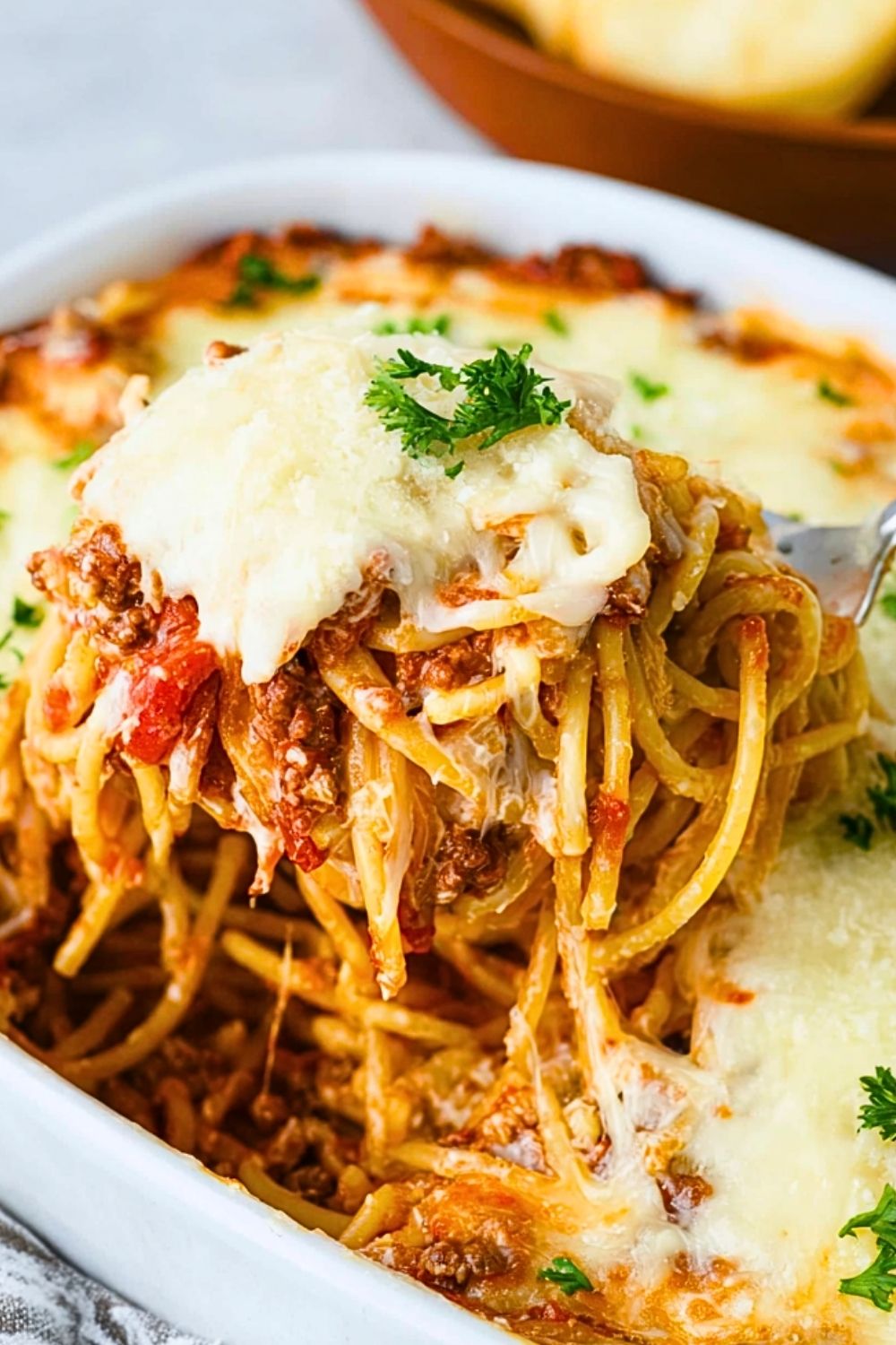 Cover the dish loosely with aluminum foil and bake for 20 minutes. Remove the foil and bake an additional 10–15 minutes, or until the cheese is melted, bubbly, and lightly golden brown. Let rest for 5 minutes before serving. Garnish with freshly chopped parsley if desired.
