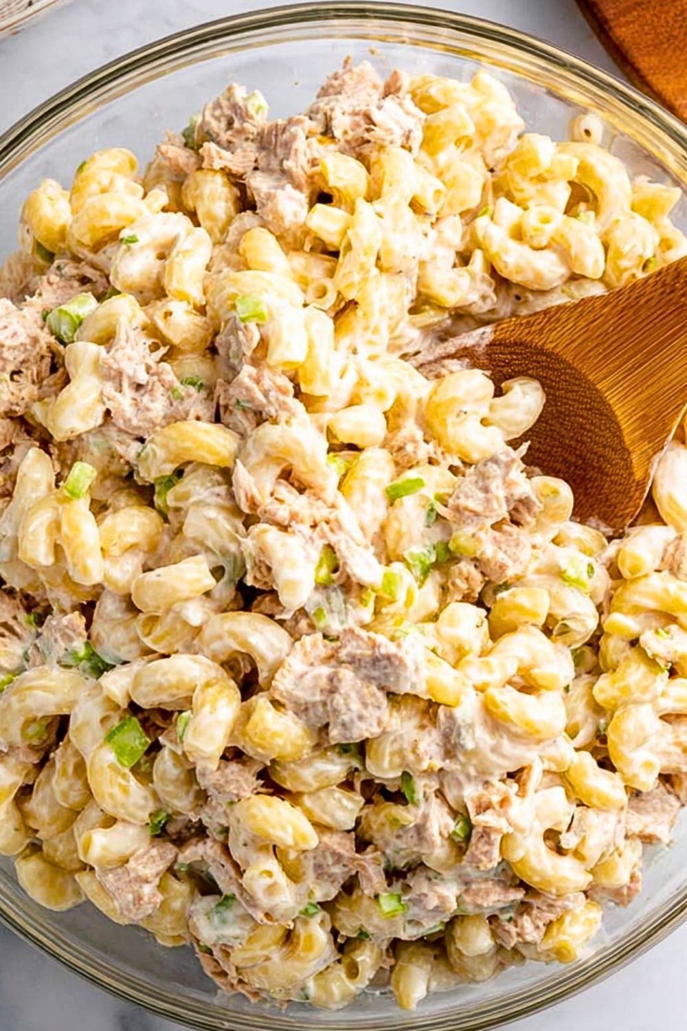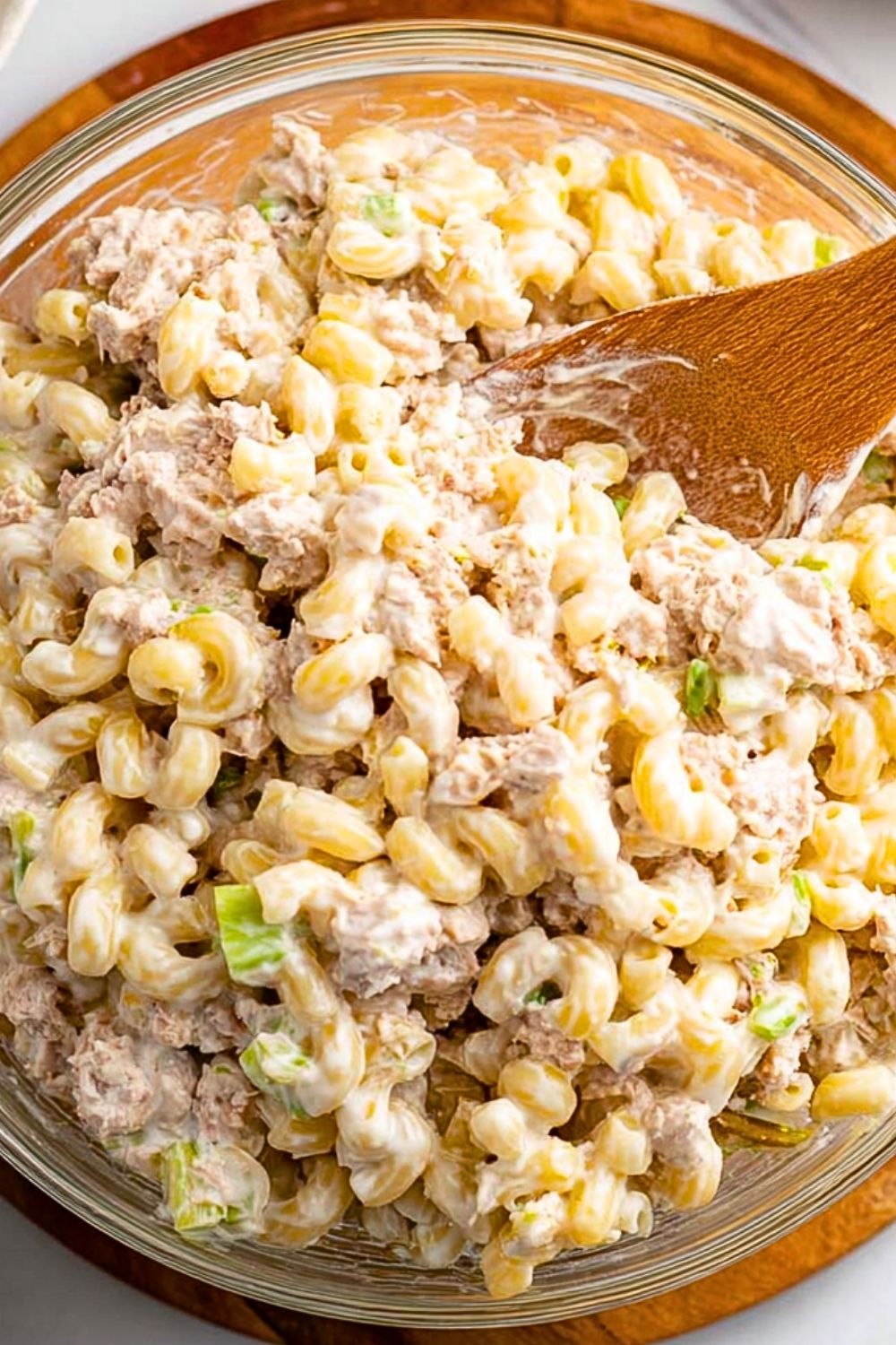 Once the macaroni is completely cool, add it to the bowl with the tuna mixture. Gently fold everything together until all the pasta is coated with the creamy dressing.