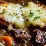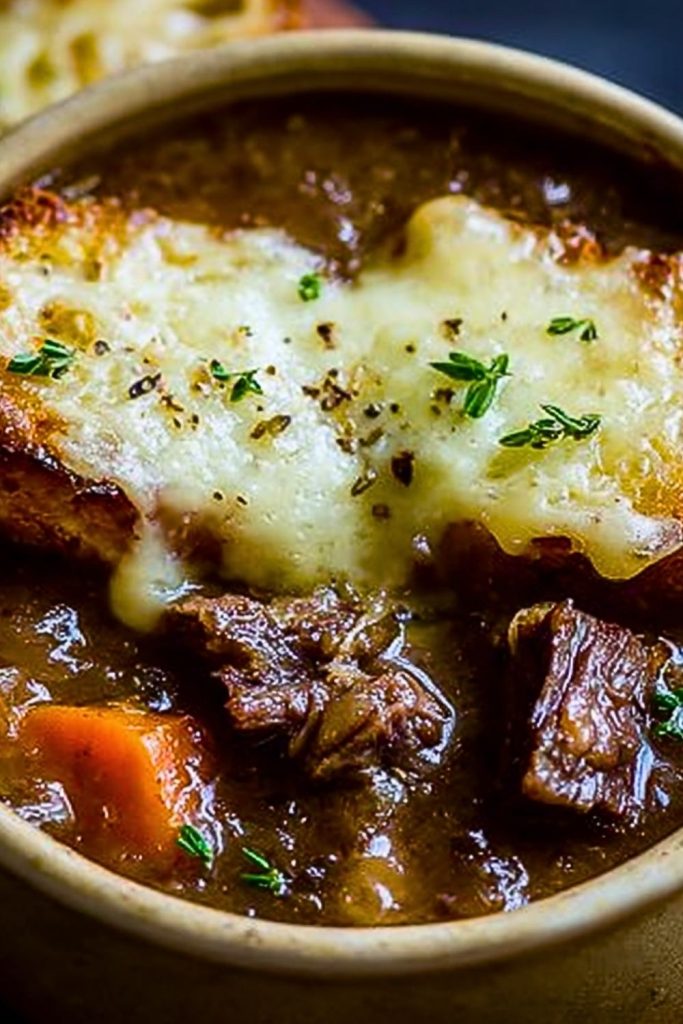 Imagine pulling a steaming bowl from the oven, where thick slices of toasted bread have soaked up a broth full of umami and herbs, topped with gooey melted cheese. Beneath the surface, buttery onions and chunks of fall-apart short rib meat float in a deeply savory stock, flavored with wine, garlic, and thyme. This isn’t just a soup—it’s a full-bodied experience made for cold nights, special dinners, or whenever your soul needs a little edible therapy.